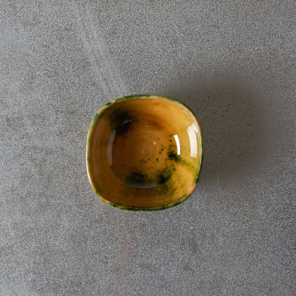 Un jus d’oxyde de cuivre d’un vert intense est projeté de manière aléatoire sur ce bol