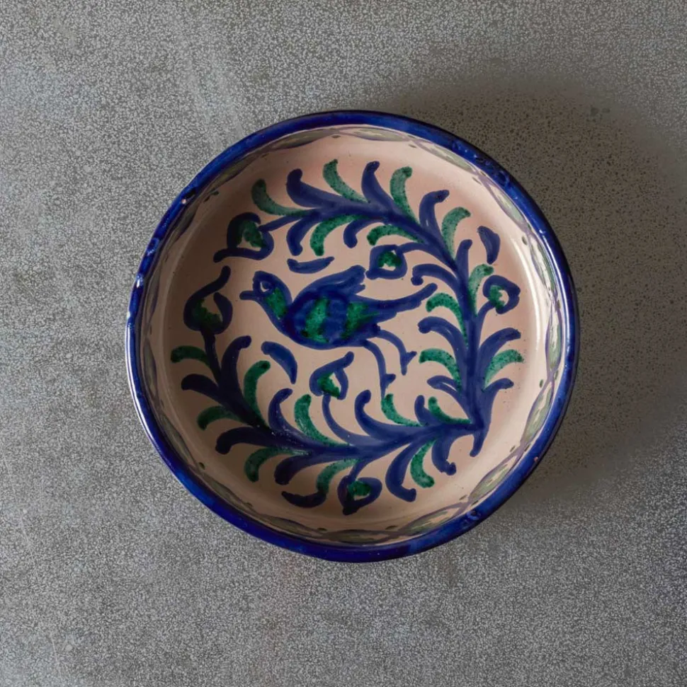 Inspiré des motifs traditionnels des céramiques andalouses du XIXe siècle, ce plat orné d’un oiseau et de végétaux est moderne et très décoratif