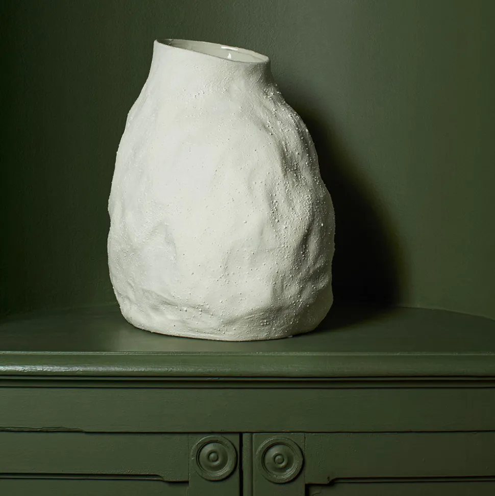 Fabriqué en grès avec un émail organique blanc cassé, le vase présente des grains minuscules et distinctifs qui rendent chaque pièce unique