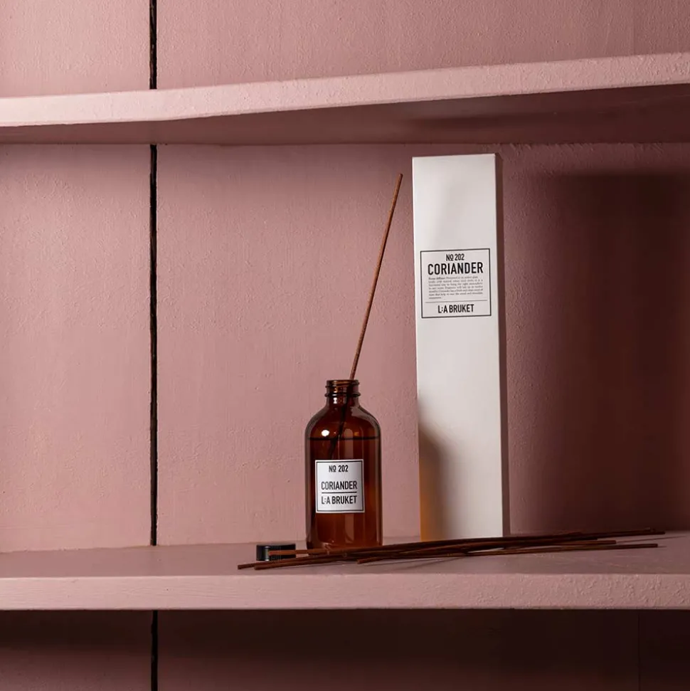 Diffuseur à bâtonnets N°202 Coriandre de L:A BRUKET. Doux parfum aux propriétés calmantes mêlant les senteurs délicates de coriandre et de menthe.. Le flacon du diffuseur est en verre ambré et comprend un bouchon. Les tiges sont en roseau naturel
