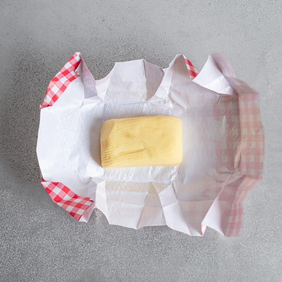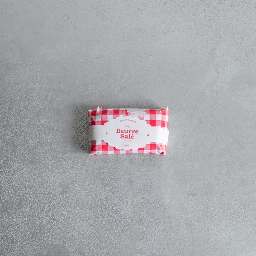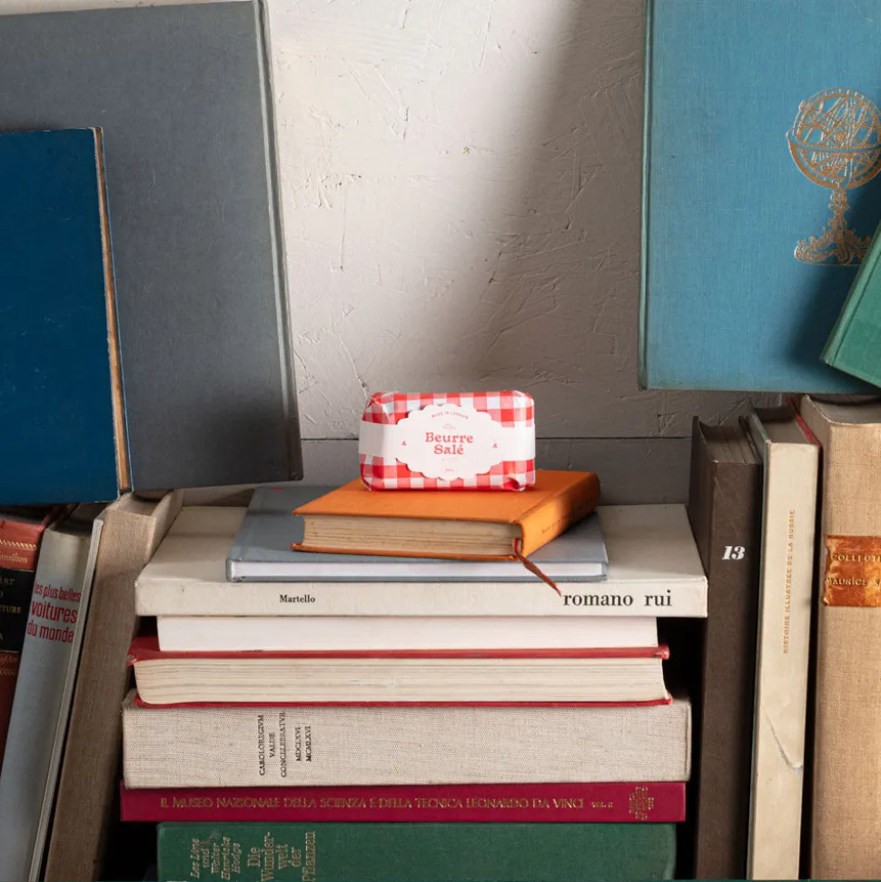 Présenté dans du papier sulfurisé vichy avec une étiquette « Beurre Salé »