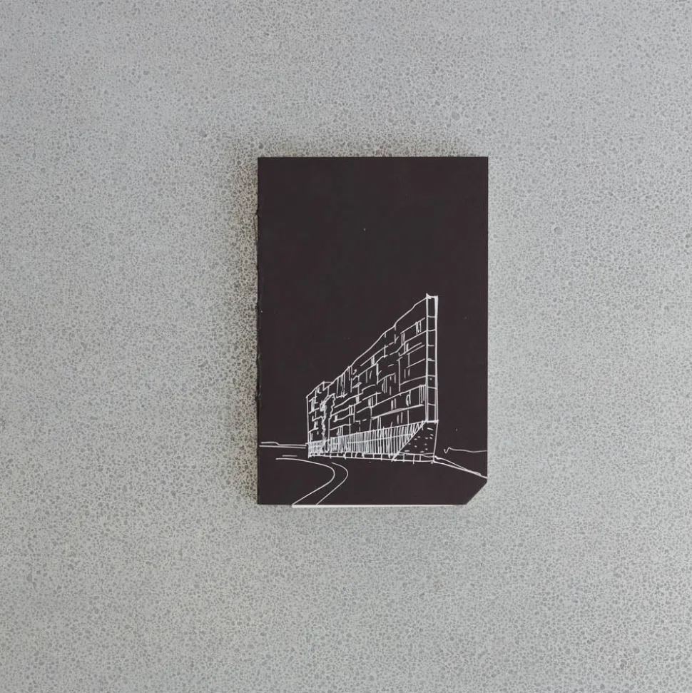 Carnet noir dont la couverture représente les nouveaux bâtiments de la BNL
