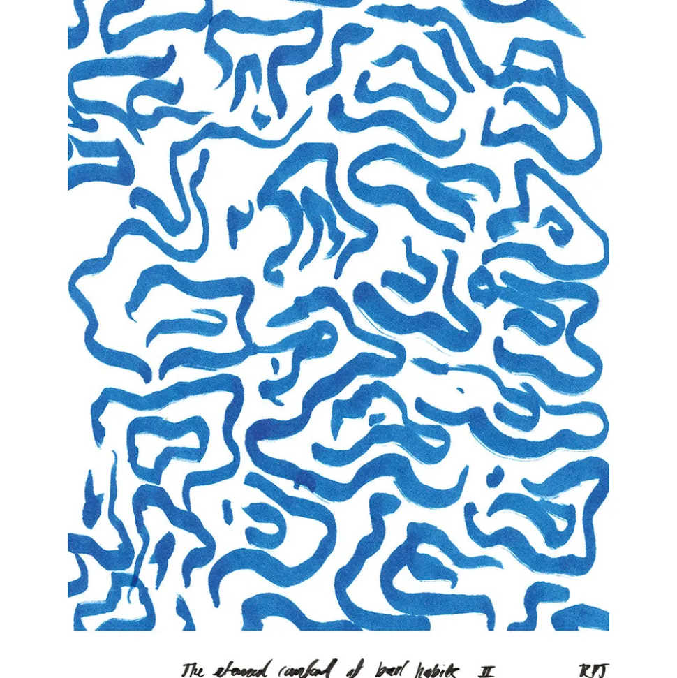 Le motif montre une jungle confuse de lignes jaunes ou bleues.