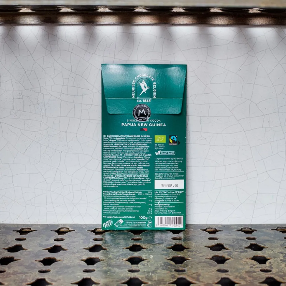 Chocolat noir aux délicats morceaux d’amandes grillées subtilement enrobés d’un caramel éclatant