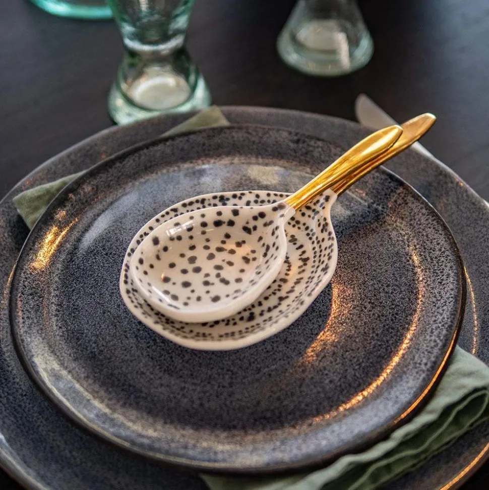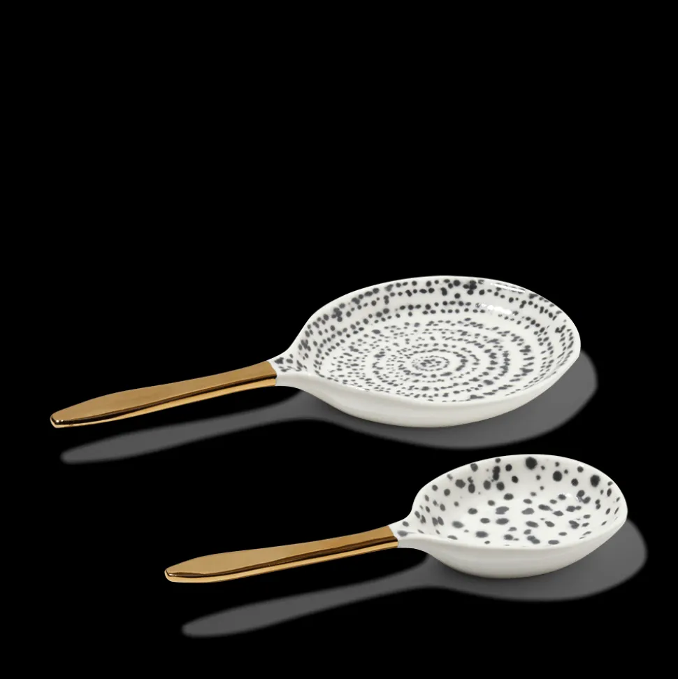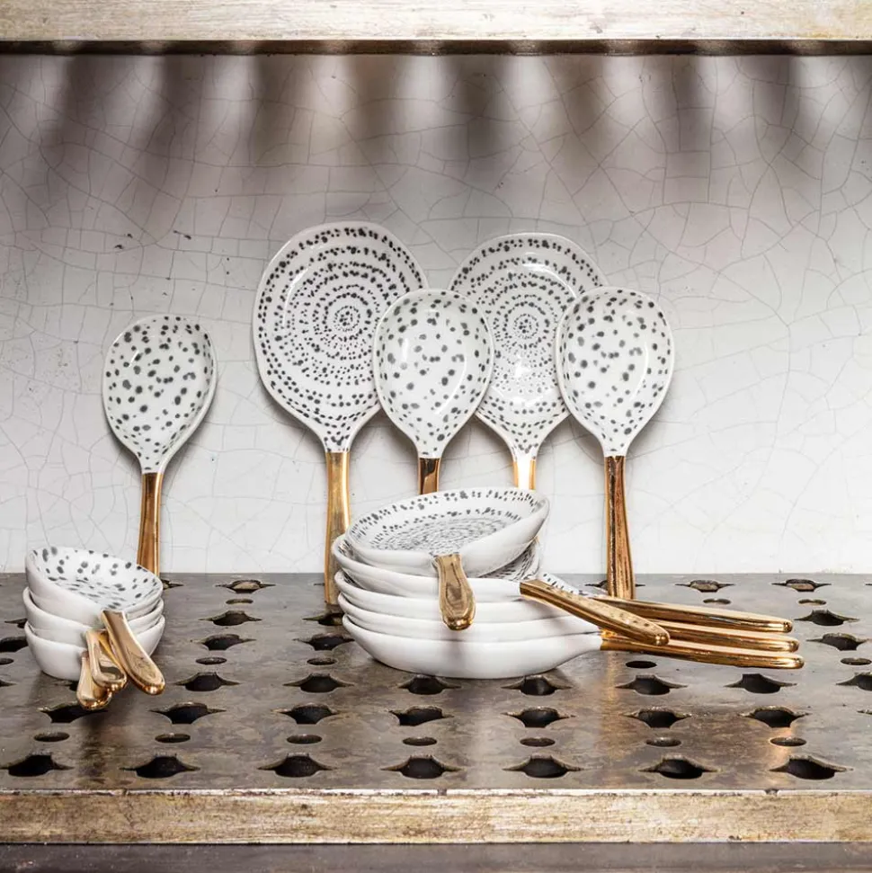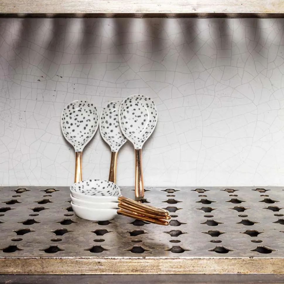 Petite cuillère de présentation en porcelaineMotif tacheté, manche doréVendue à l’unitéDeux tailles disponibles:Pe…