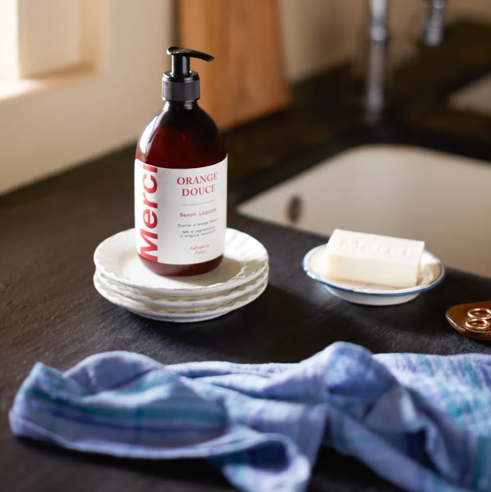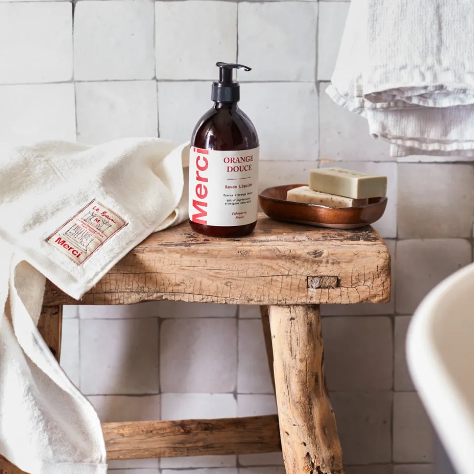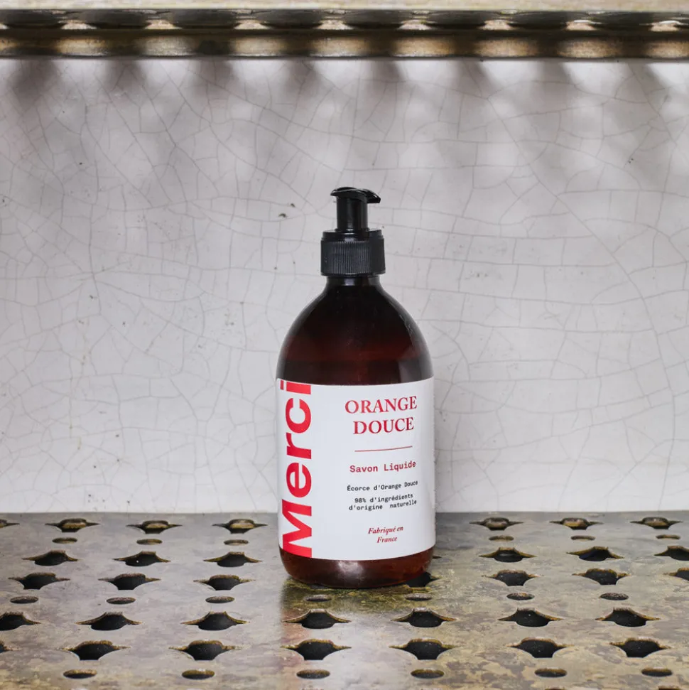 Le savon liquide Merci devient un objet sobre que l’on prend plaisir à exposer aussi bien dans la salle de bains que dans la cuisine.