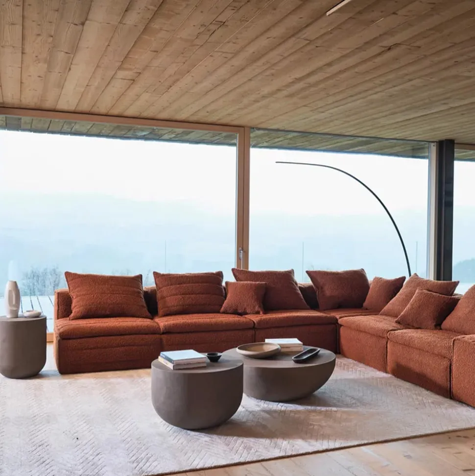 La collection se compose de tables basses en polymère haute densité, finition avec couche d’argile. Traitement antitache mat. Disponible en trois couleurs: Ombra, Cassel ou bien Siena