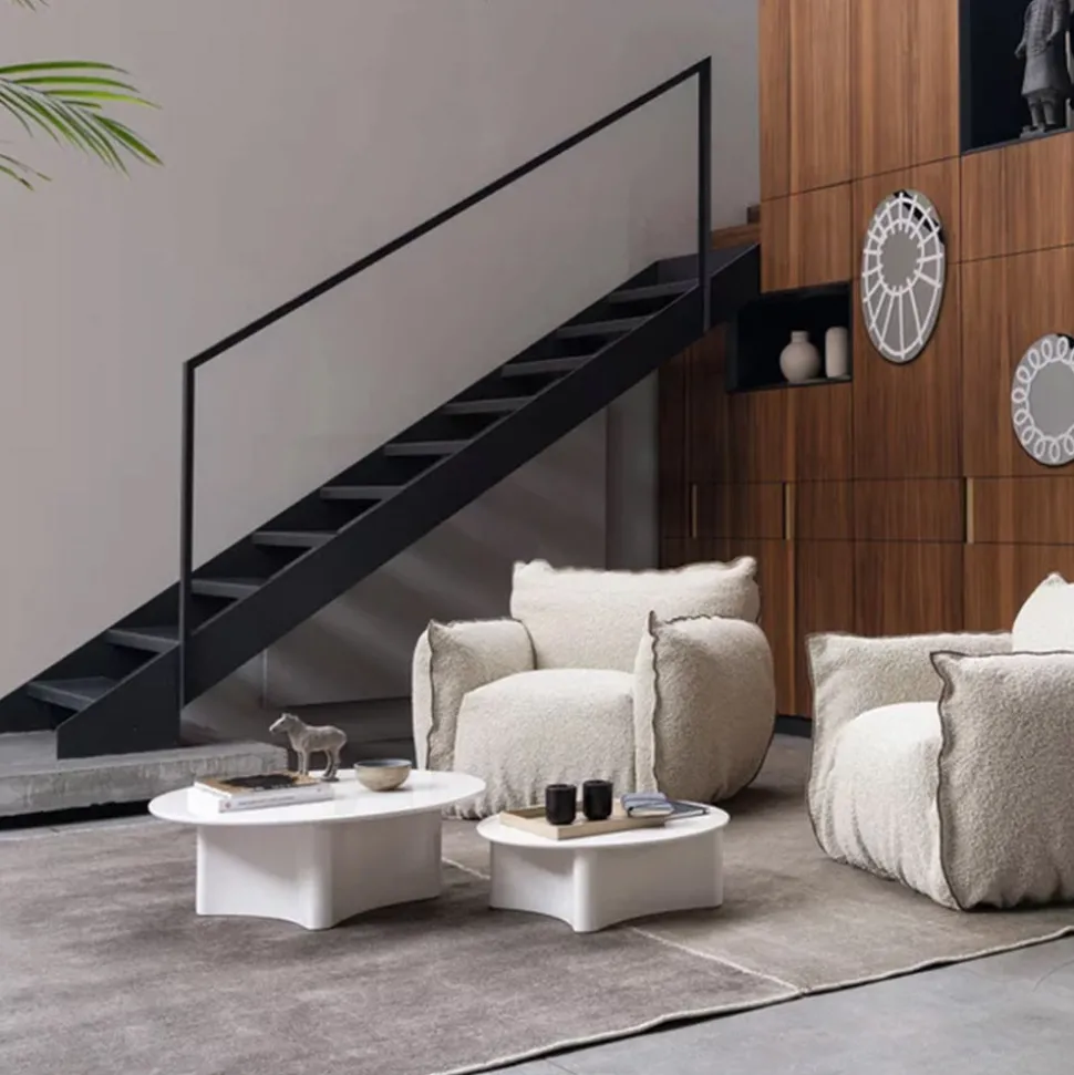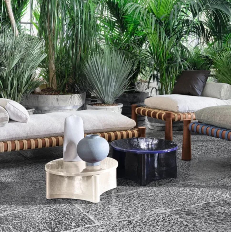 Tables basses avec leur plateau rond et leur base sculpturale en Millgres
