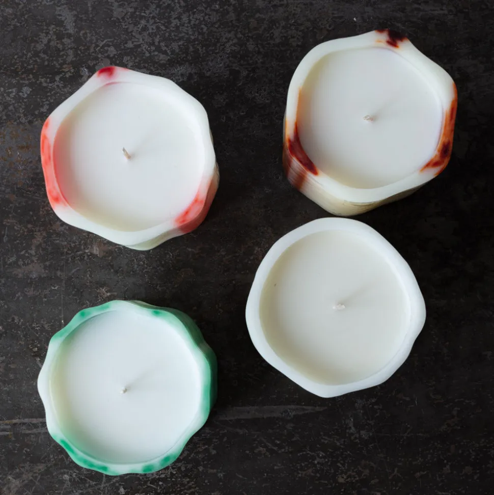 Chaque bougie est fabriquée à la main, depuis le mélange des couleurs et des parfums jusqu’au remplissage de la bougie de soja