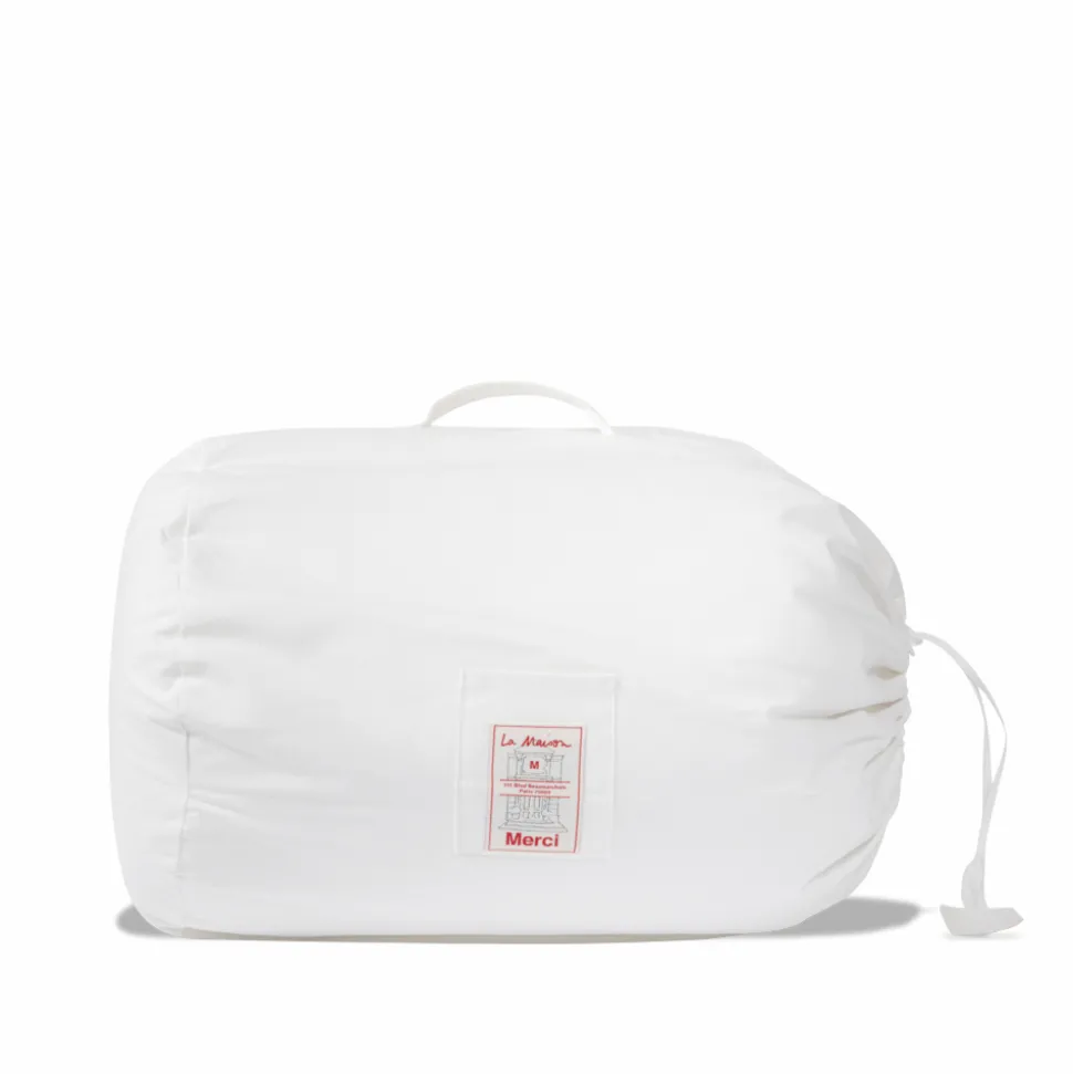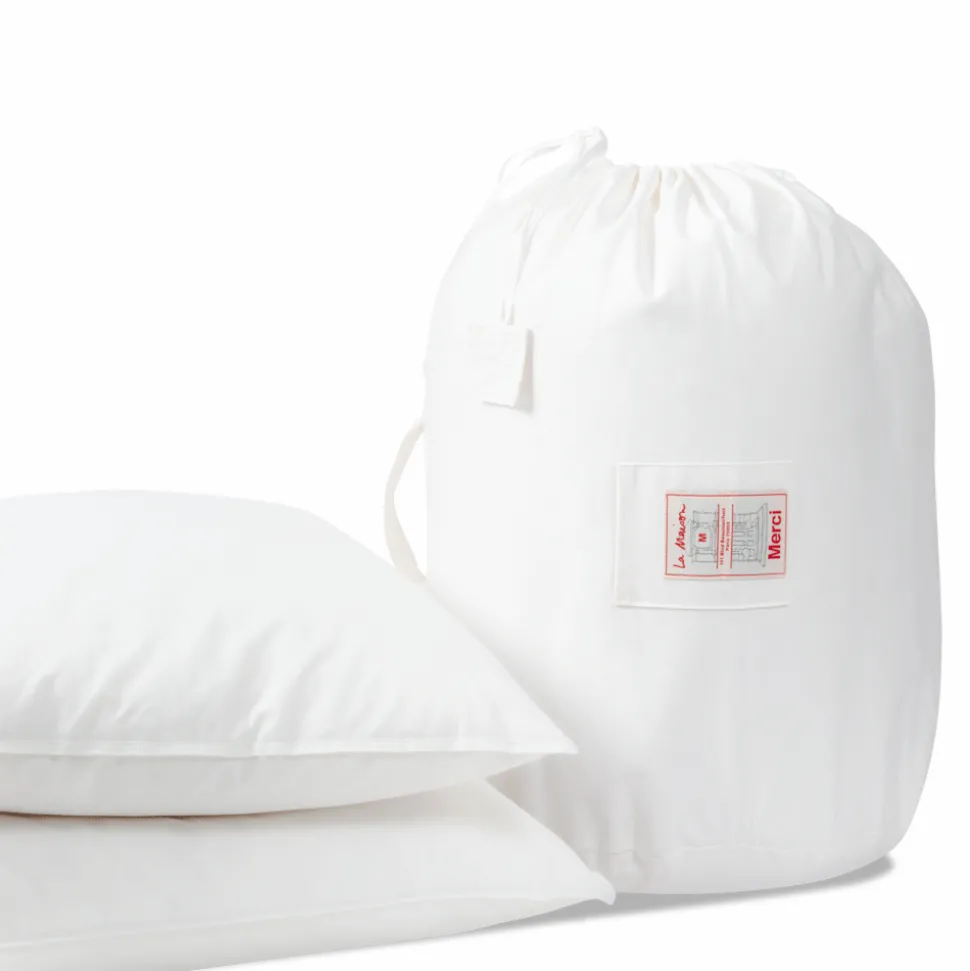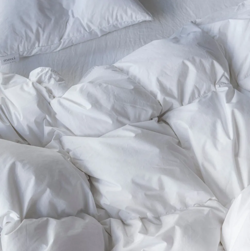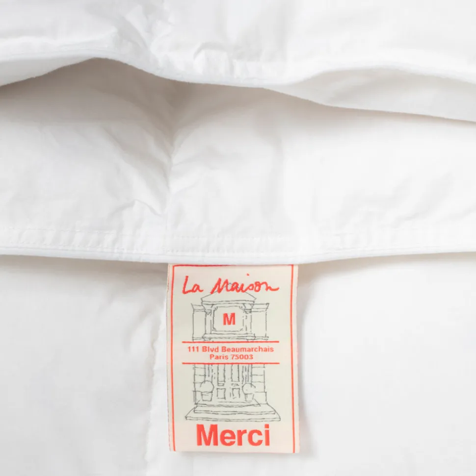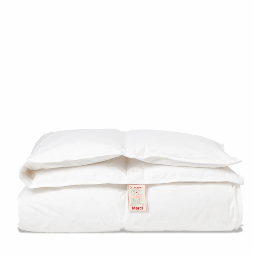Merci propose une couette douce, légère et respirante en duvet de canard. Fabriquée dans le sud-ouest de la France et certifiée 100% OekoTex pour le tissu et pour le garnissage.