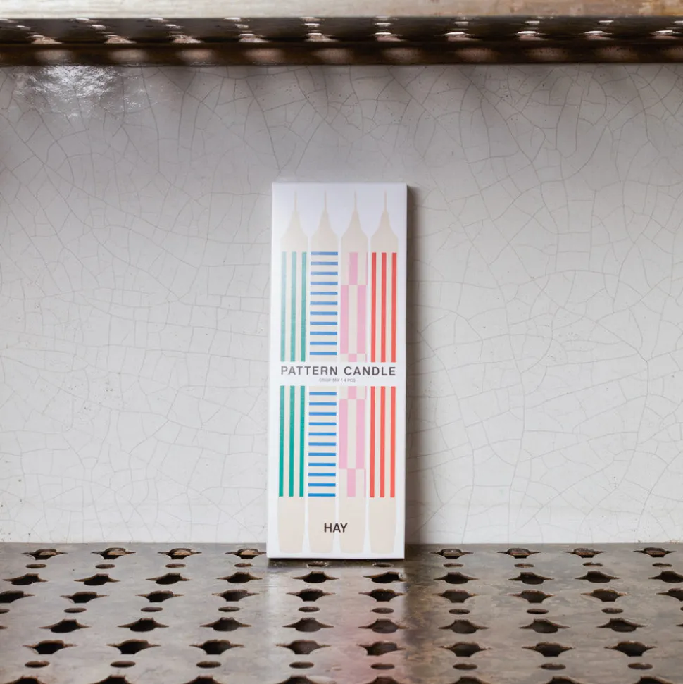 Longues bougies cylindriques à motifs combinant des nuances de couleurs claires