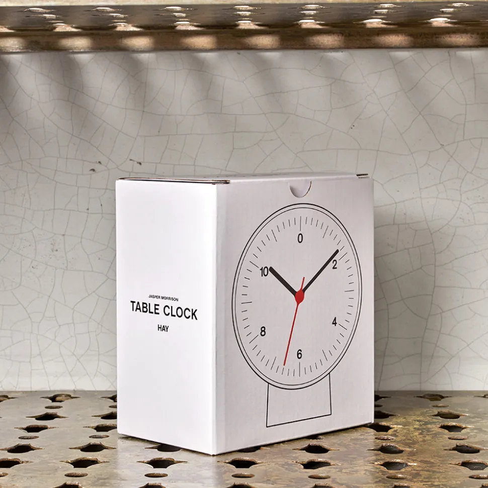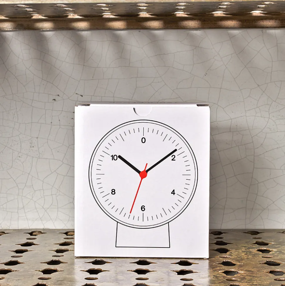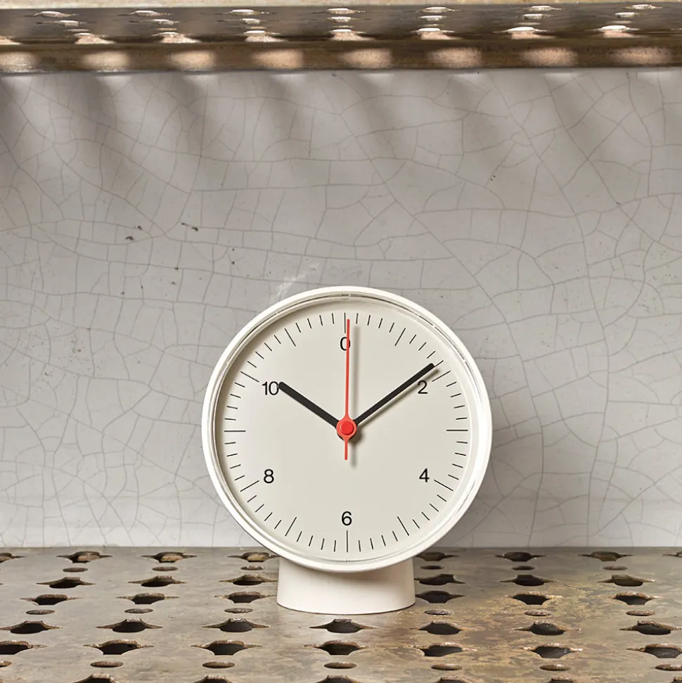 Conçue par Jasper Morrison, l’horloge de table à double fonction est montée sur un support amovible, ce qui permet aux utilisateurs de placer l’horloge sur une table ou de l’accrocher au mur.