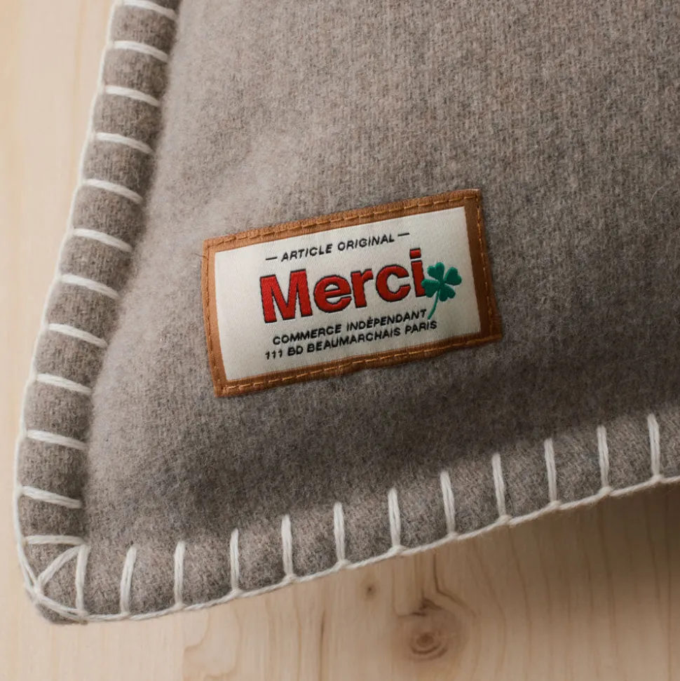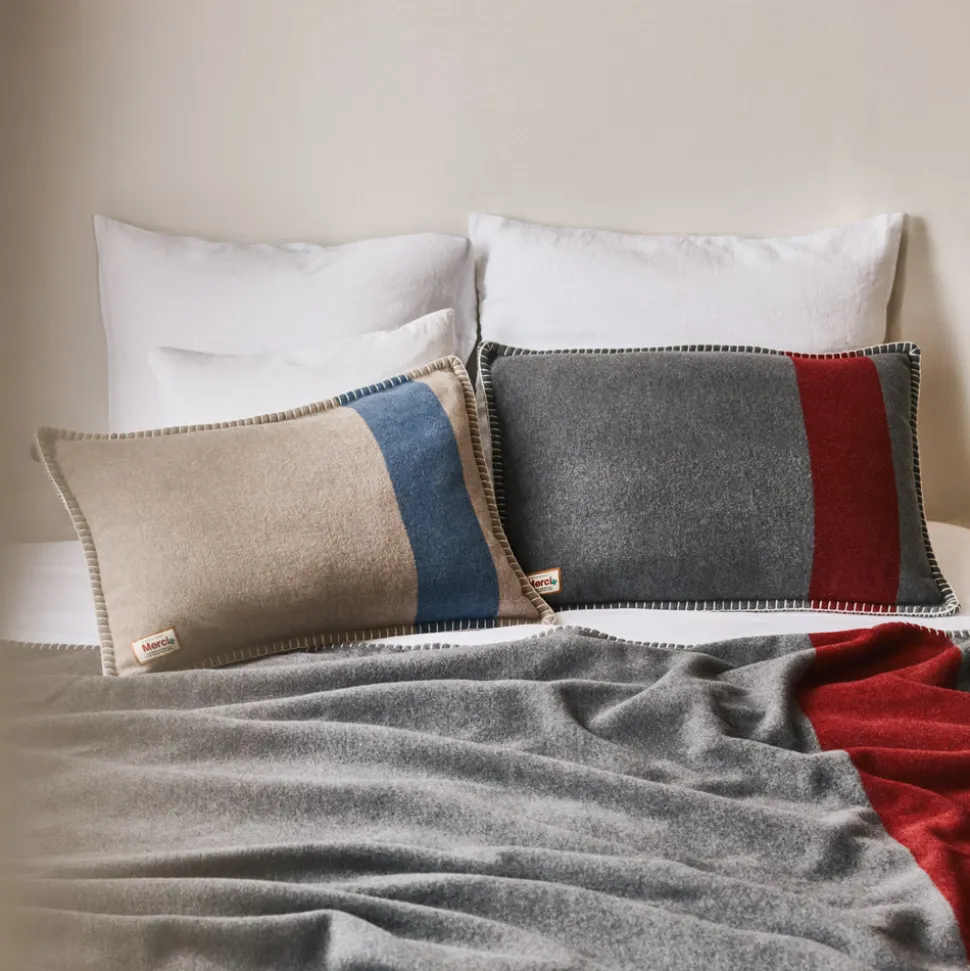 Pour l’arrivée de l’automne, Merci dévoile avec fierté sa collection de couvertures et de coussins en laine d’alpaga. Fabriqués en Italie, chaque détail a été soigneusement choisi. Disponibles en deux combinaisons de couleurs : beige avec une rayure bleu denim et gris avec une rayure rouge foncé, ces pièces assorties sont rehaussées d’un point de cheval écru sur la bordure.