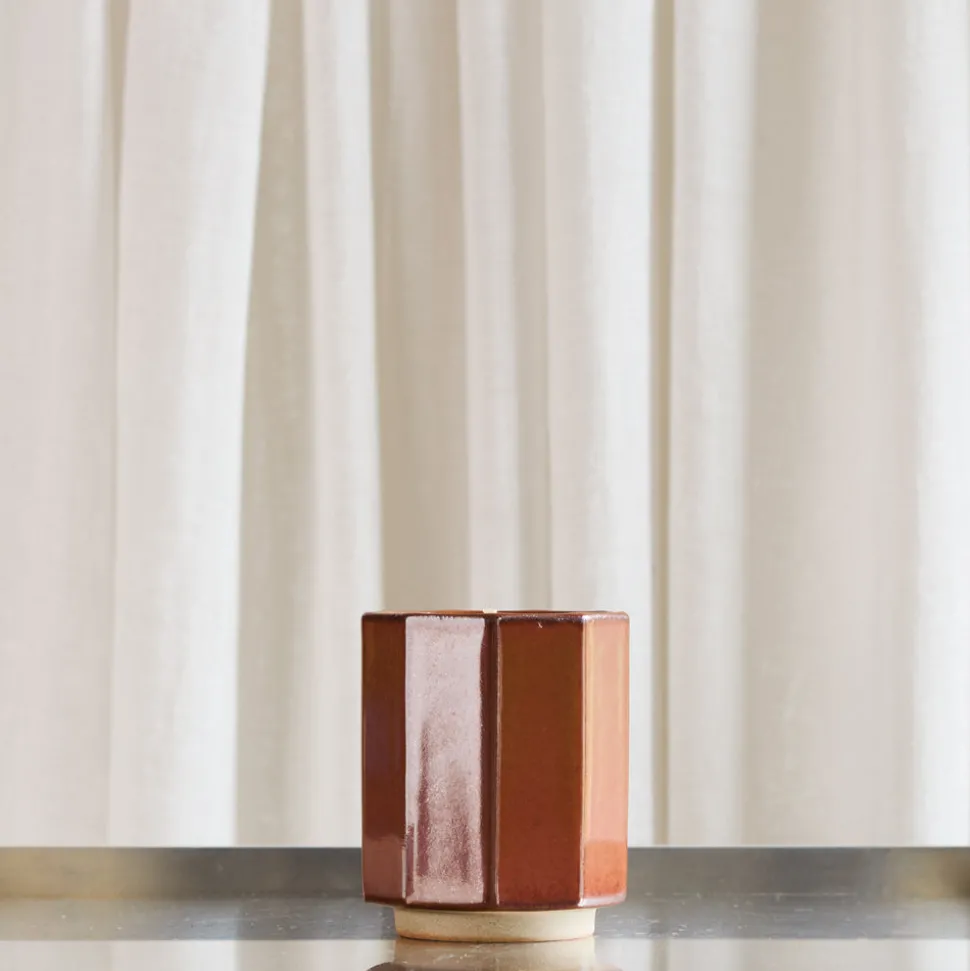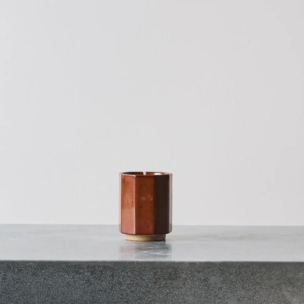 La bougie Onji rappelle les années 70, avec sa forme géométrique et son émail brun terreux