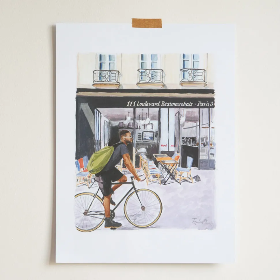 Affiche Bicycle : « À mes yeux, cette image représente le rythme effréné de la vie parisienne, c’est la capture d’un moment, les coursiers à vélo et la jolie vitrine de Merci. »