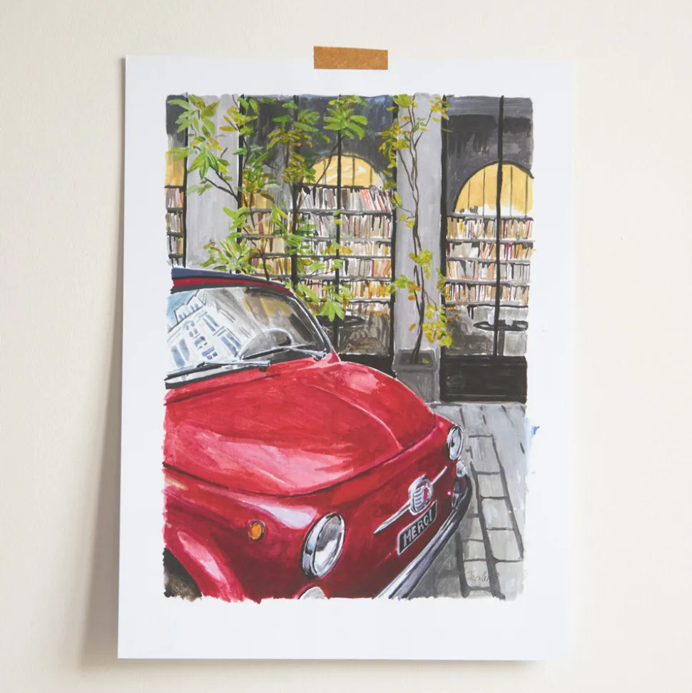 Affiche Library View : “La cour pavée de chez Merci est devenue l’une de mes inspirations, j’y trouve beaucoup de réconfort à observer la bibliothèque. La lecture a toujours été mon refuge. Je pourrais passer des heures immergé dans les pages d’un livre découvrant des récits captivants et vivant une excitation pure.”