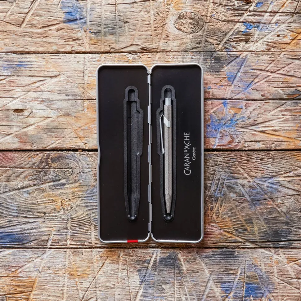 Un stylo bille iconique de Caran d’Anche très résistant, mécanisme à pression avec le logo Caran d’Ache gravé autour du bouton poli