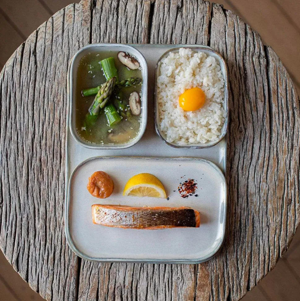 Assiette plate en grès inspirée du célèbre service American Modern Dinnerware créé dans les années 50 par le designer américain Russel Wright, et du traditionnel bento japonais