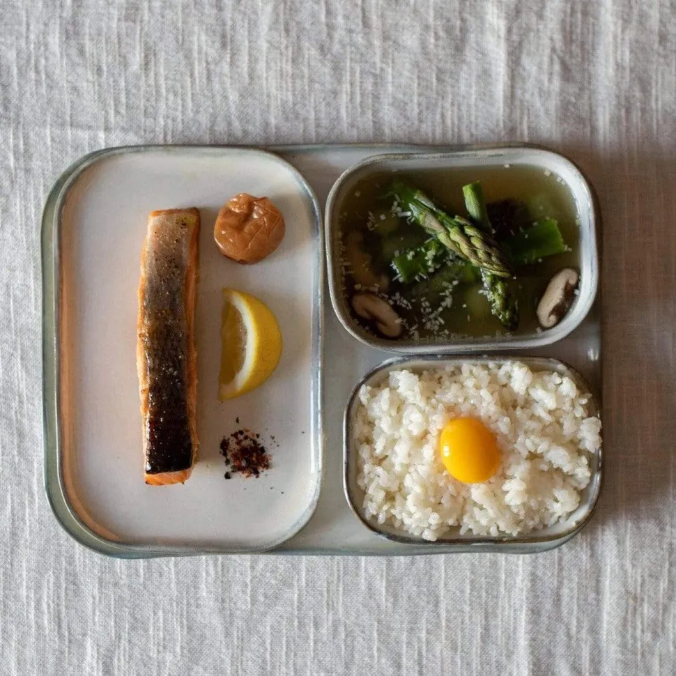 Assiette plate en grès inspirée du célèbre service American Modern Dinnerware créé dans les années 50 par le designer américain Russel Wright, et du traditionnel bento japonais