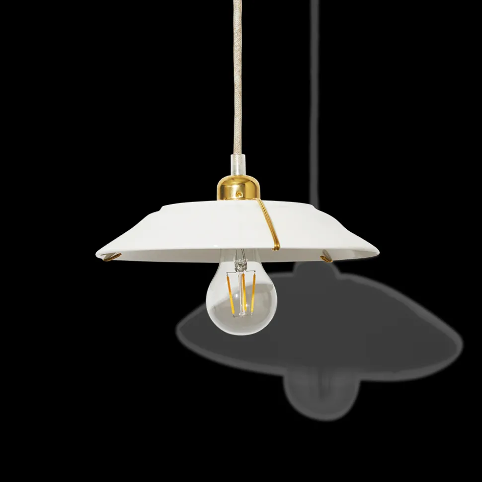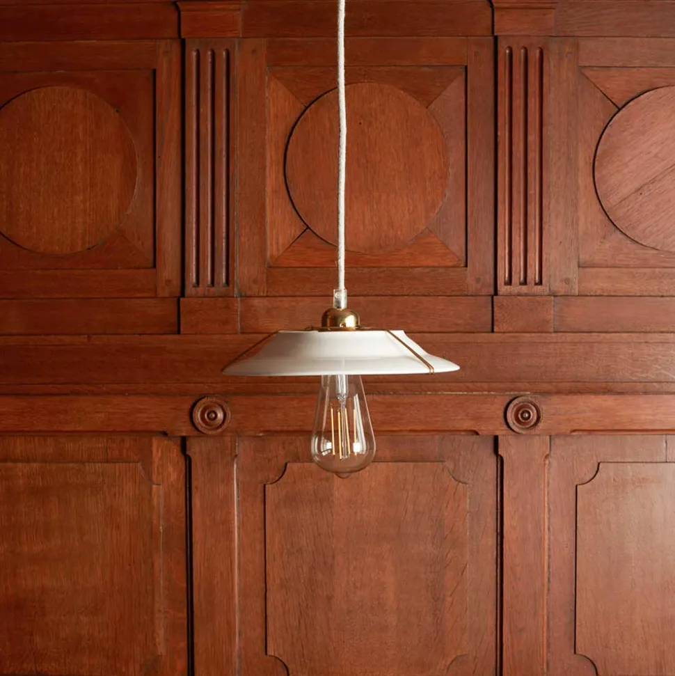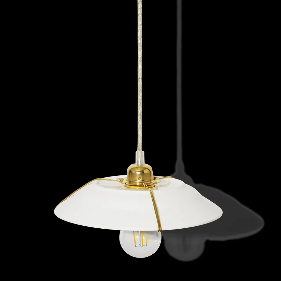 Ce luminaire se caractérise par un design relativement simple mais parfaitement distingué. Sans détails superflus, il se compose d’une fine structure en laiton entourant une assiette en grès blanche qui fait office d’abat-jour.