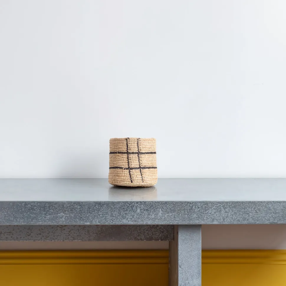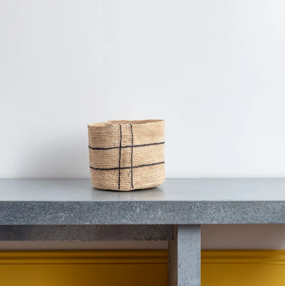 Panier en raphia fabriqué de façon artisanale avec un carré noir sur le côté