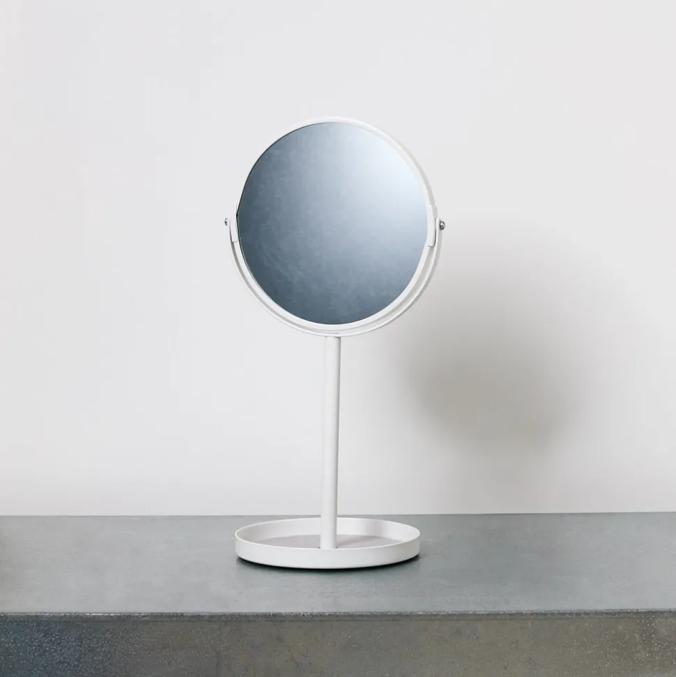 Miroir de courtoisie rond doté d’un plateau inférieur pour ranger les objets de la commode et du bureau. Le miroir à deux faces pivote sur l’axe et le plateau inférieur permet de ranger toutes vos bricoles au même endroit.