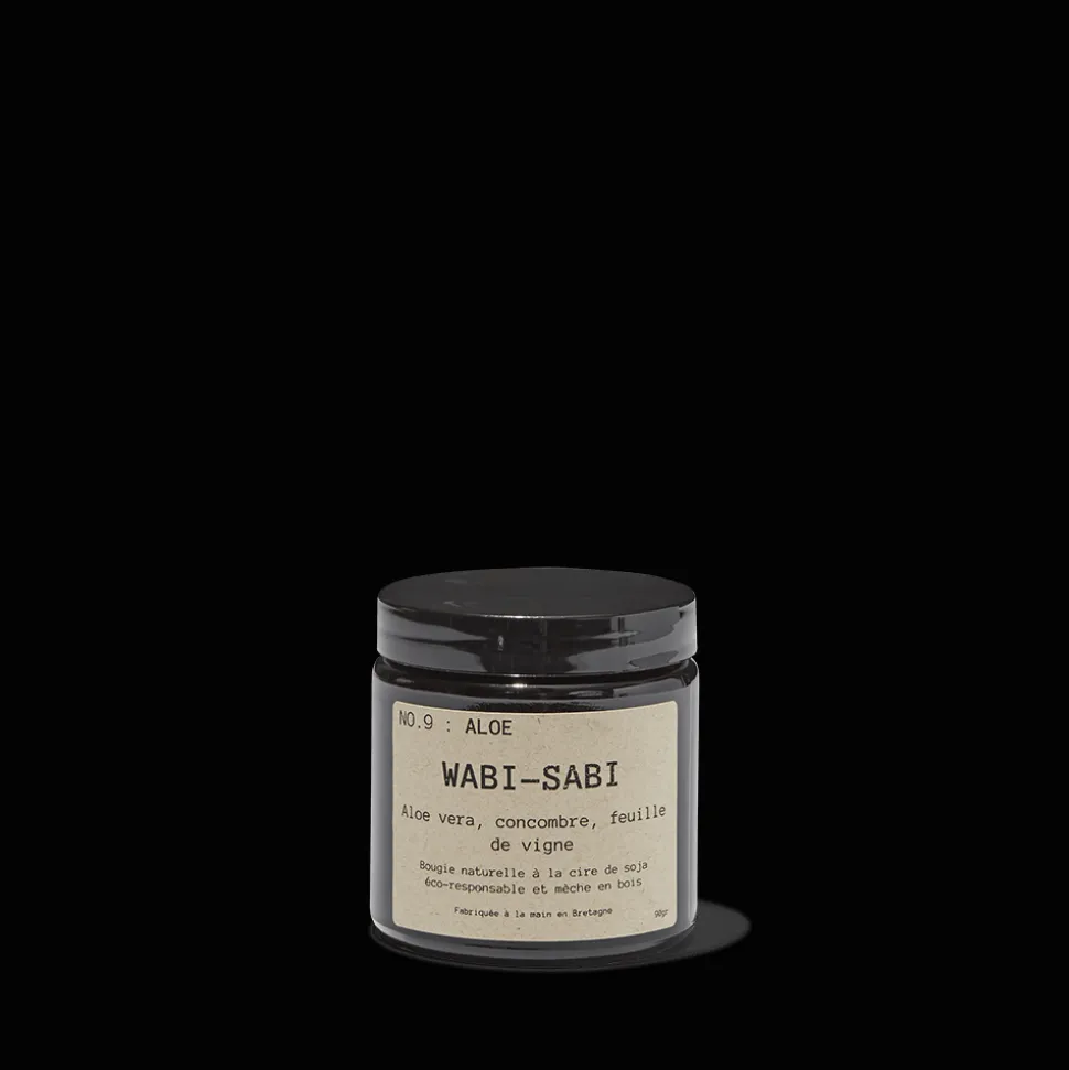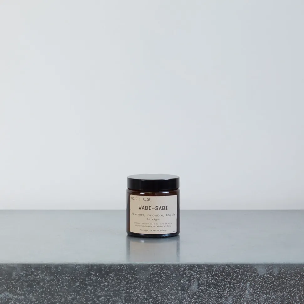 Mèche en bois et pot en verre recyclable. L’étiquette est issue du recyclage