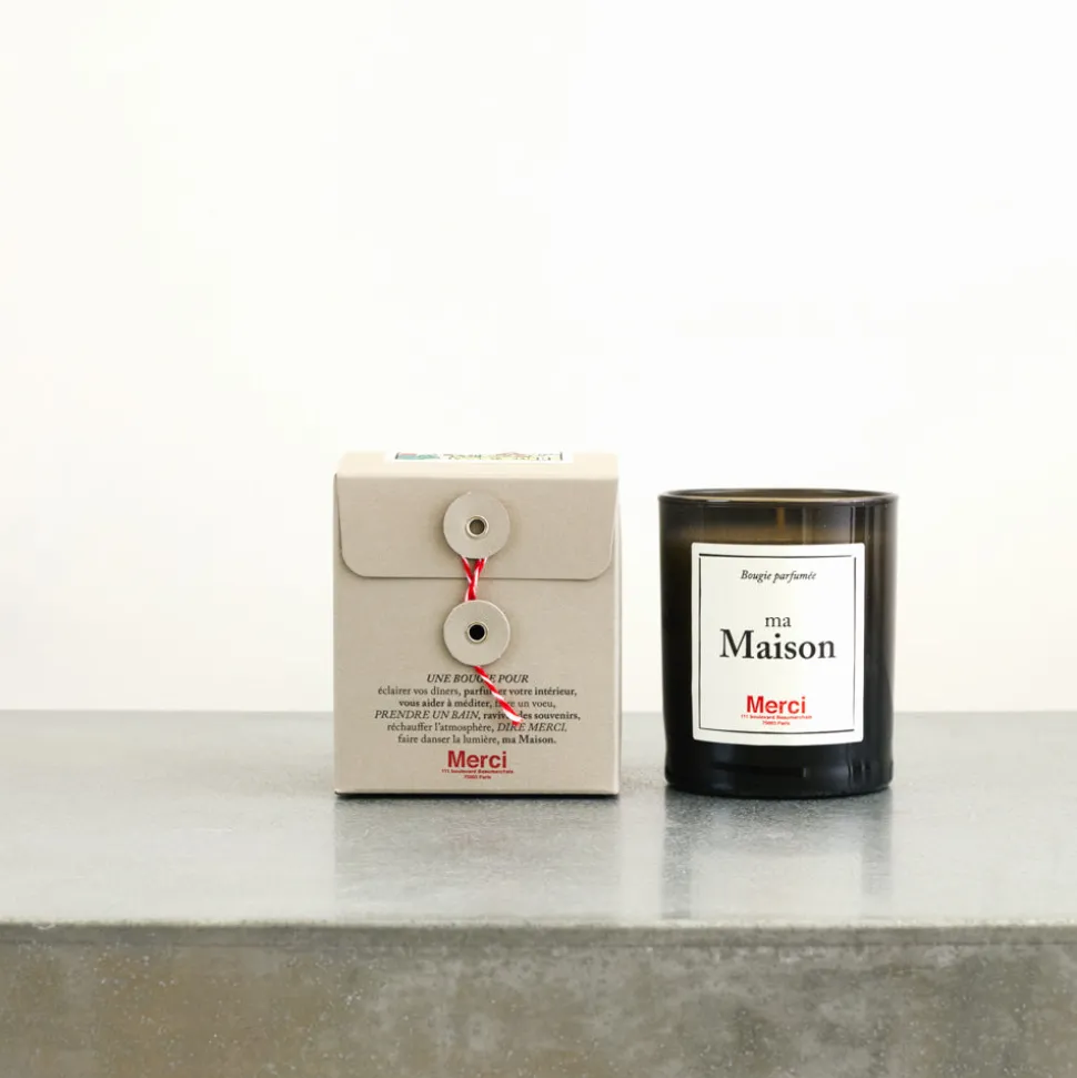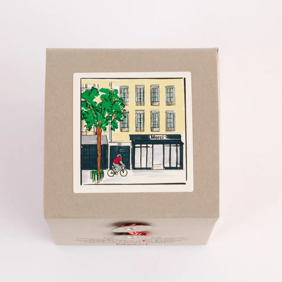 La bougie « Ma maison » est la senteur iconique de Merci. Elle se décline dans trois écrins illustrant des scènes typiques de Paris. Inspirée par l’art de vivre parisien, elle capture l’effervescence, le charme et la douceur de la ville. Fabriquée en France, elle incarne l’essence de Paris avec une élégance simple et naturelle, comme une ode à la ville lumière et à sa beauté unique.