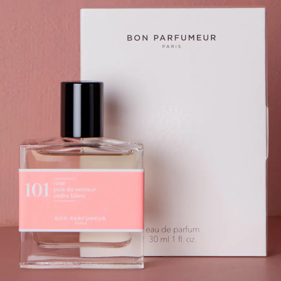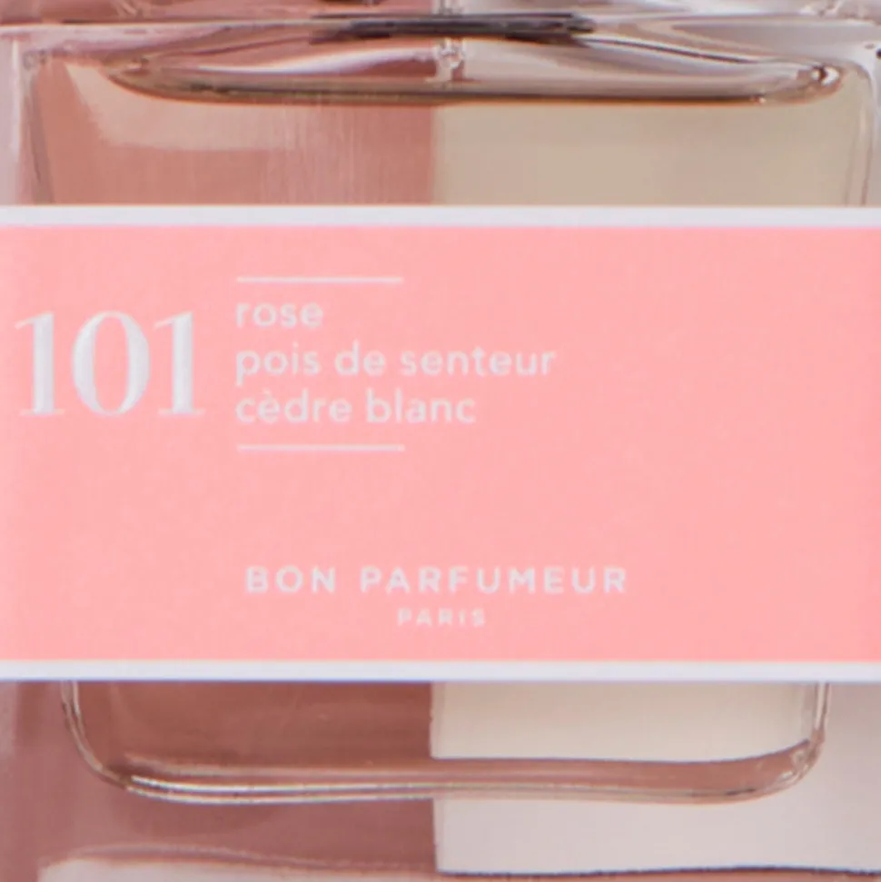 Eau de parfum N°101 Bon Parfumeur aux accents doux et fleuris, rose, pois de senteur et cèdre blanc, pour une senteur épicée et exaltante. Vegan et cruelty free. Notes de tête : bergamote, cardamome, lavande