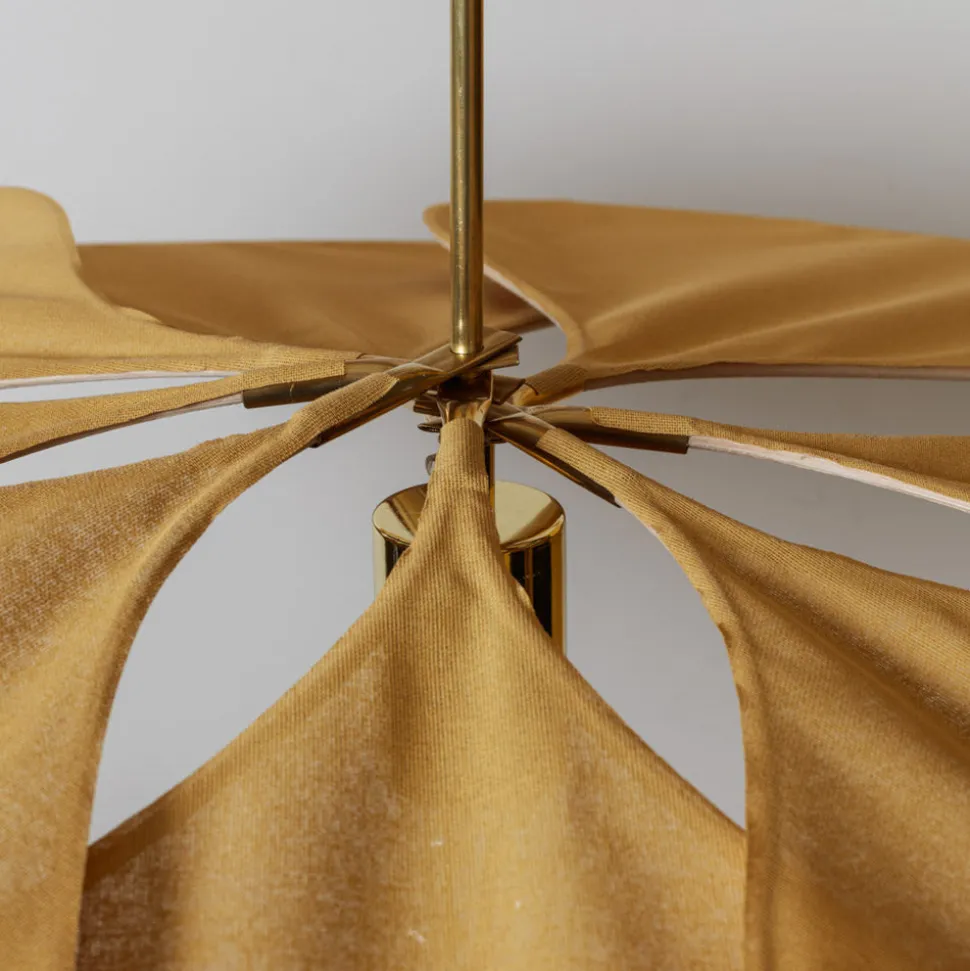 Pour obtenir ce résultat subtil et aérien, il aura fallu associer laiton, rotin et tissu pour donner forme à cette suspension florale, réminiscente des pétales de fleurs