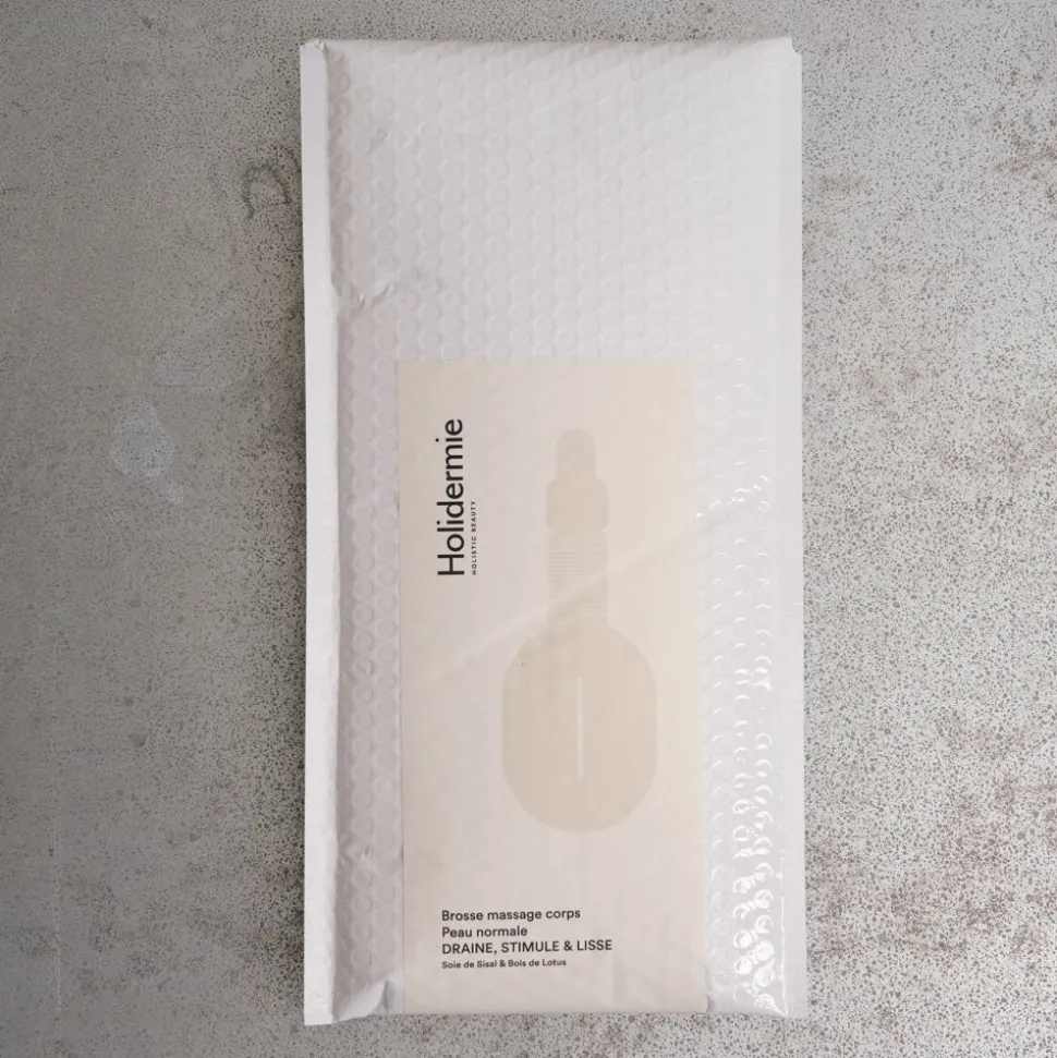 Brosse de massage spécifique à utiliser avant application de crème ou de lait, pour une meilleure assimilation des actifs