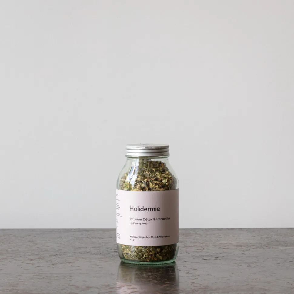 La Tisane détox et immunité Holidermie est un assemblage vertueux de plantes traditionnelles issues de l’agriculture biologique et d’adaptogènes