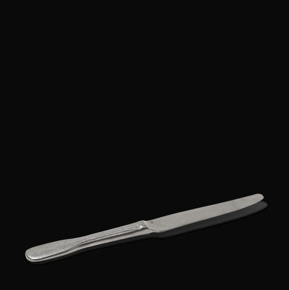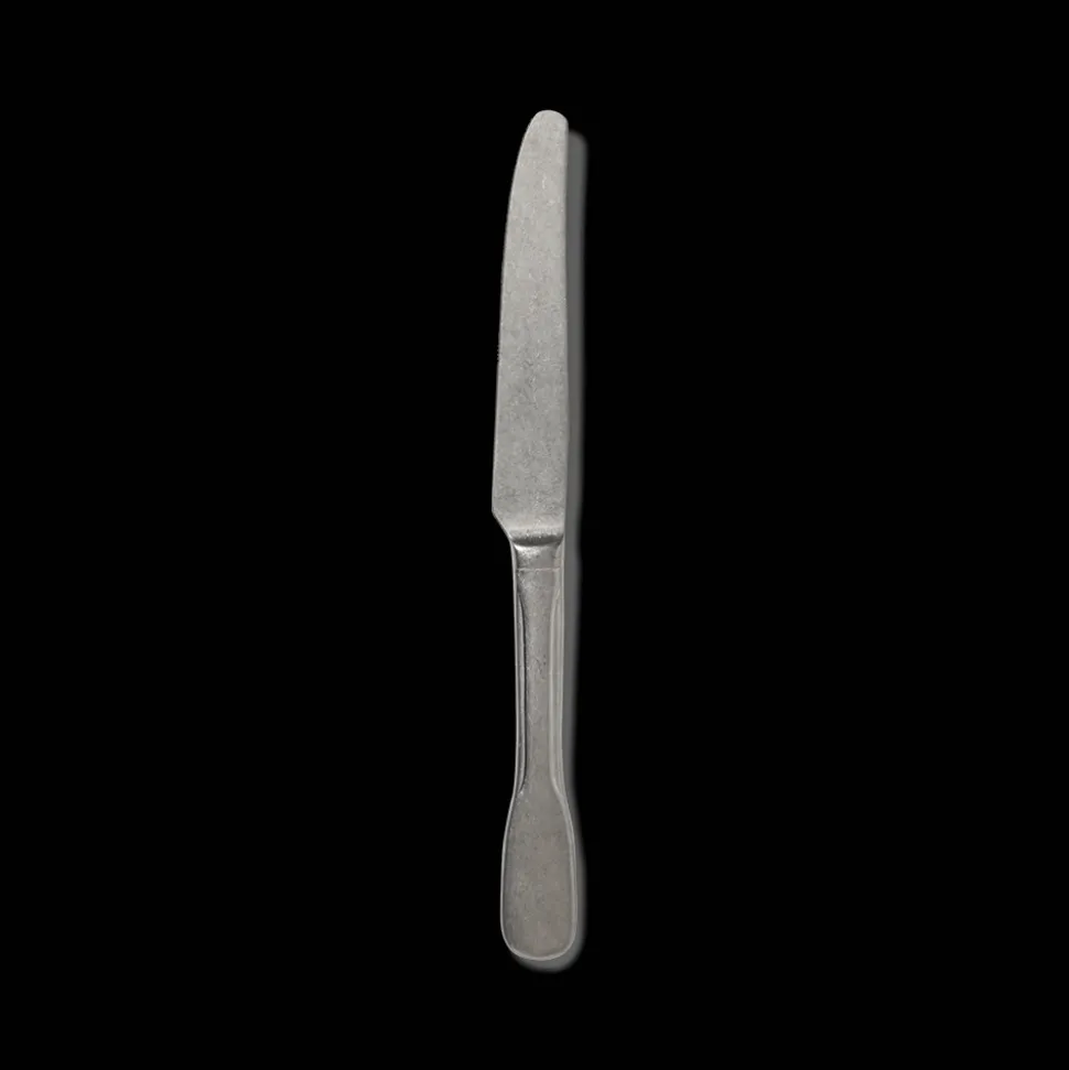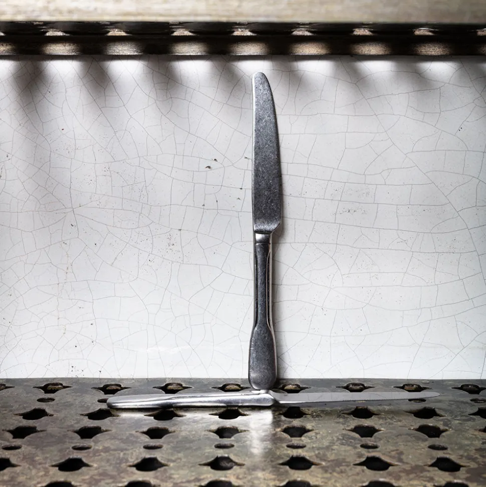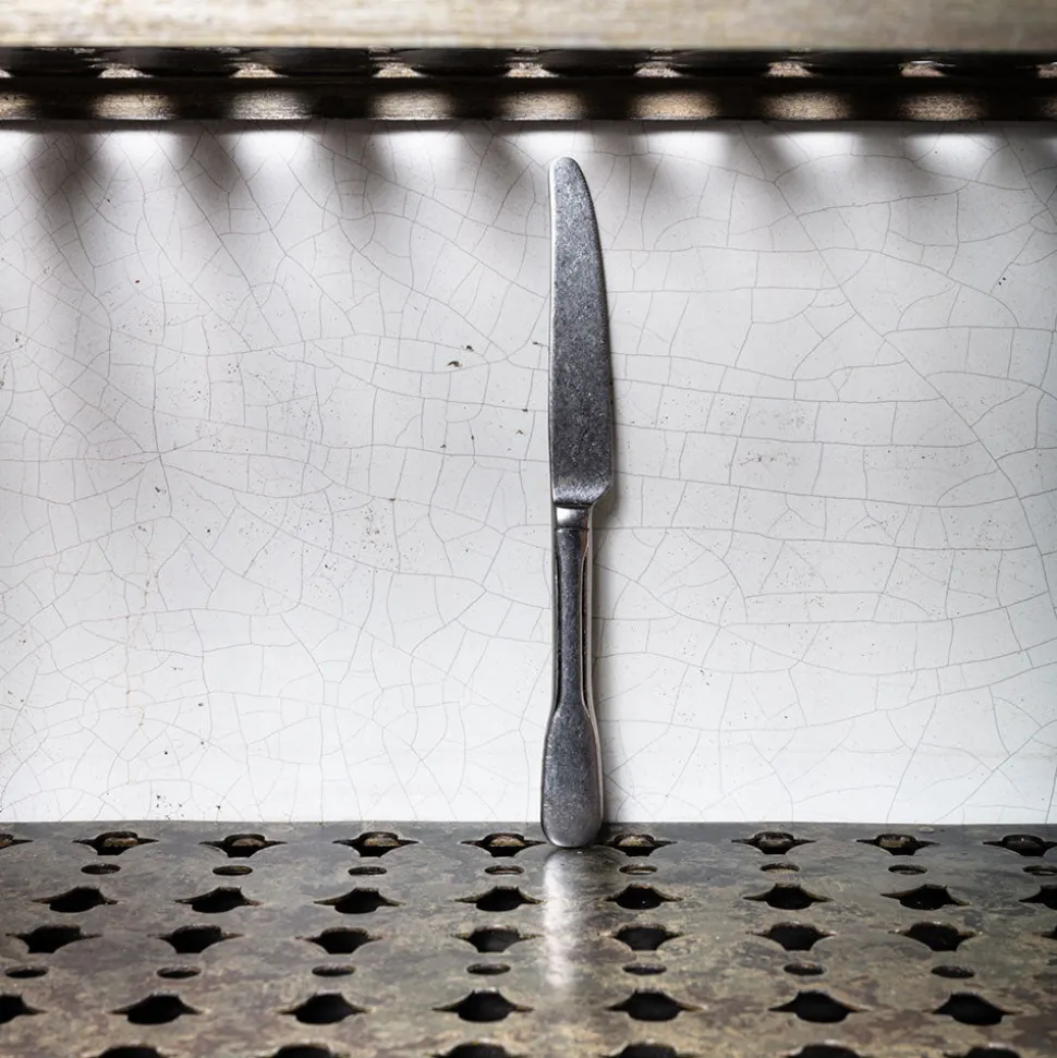 La finition vieillie de lu couteau contraste avec ses lignes contemporaines