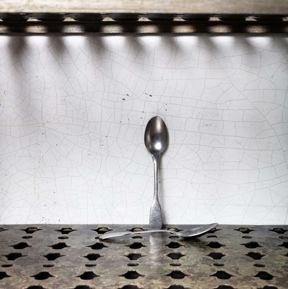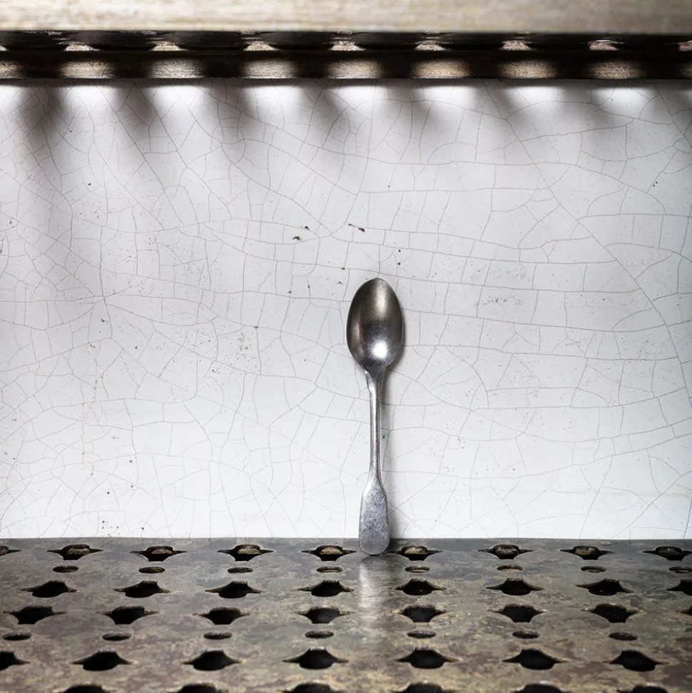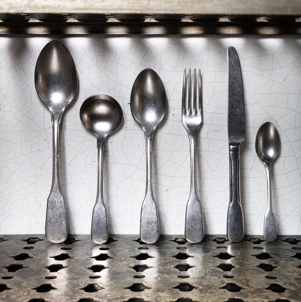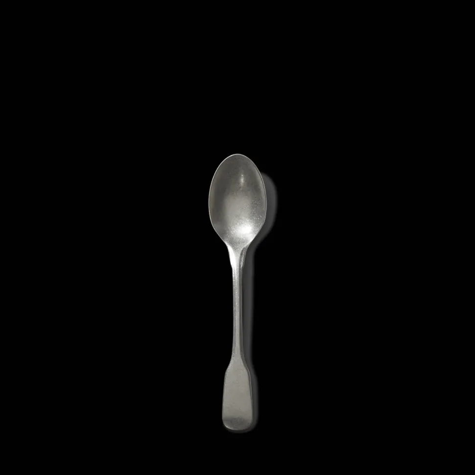 La finition vieillie de la cuillère à café contraste avec ses lignes contemporaines