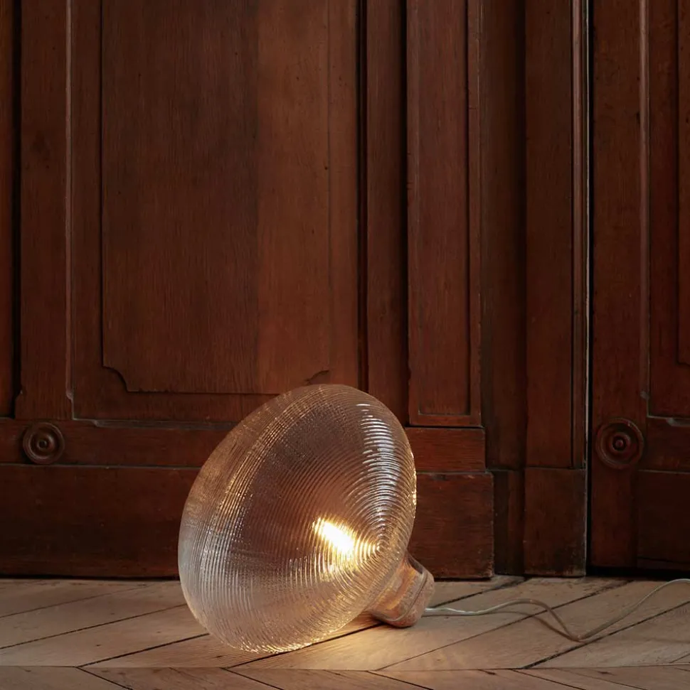Texturé, son globe en verre diffuse une lumière d’ambiance douce et chaleureuse ; épais, il permet de poser la lampe au sol ou sur un meuble sans risque