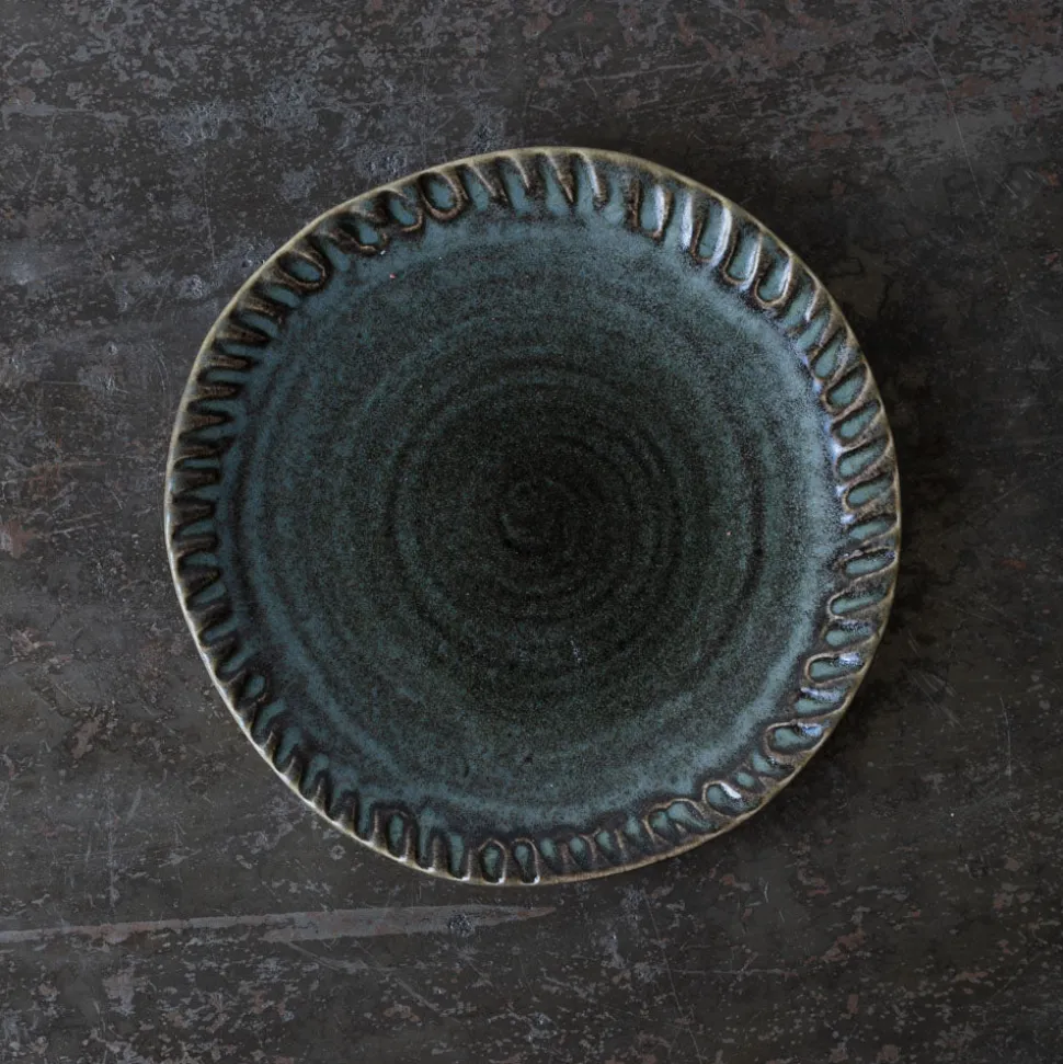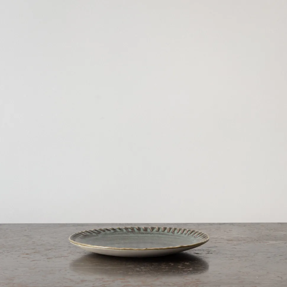 Assiette plate en grès émaillé (et brut en dessous) irrégulière de la collection Dashi imaginée par le designer Pierre Casenove