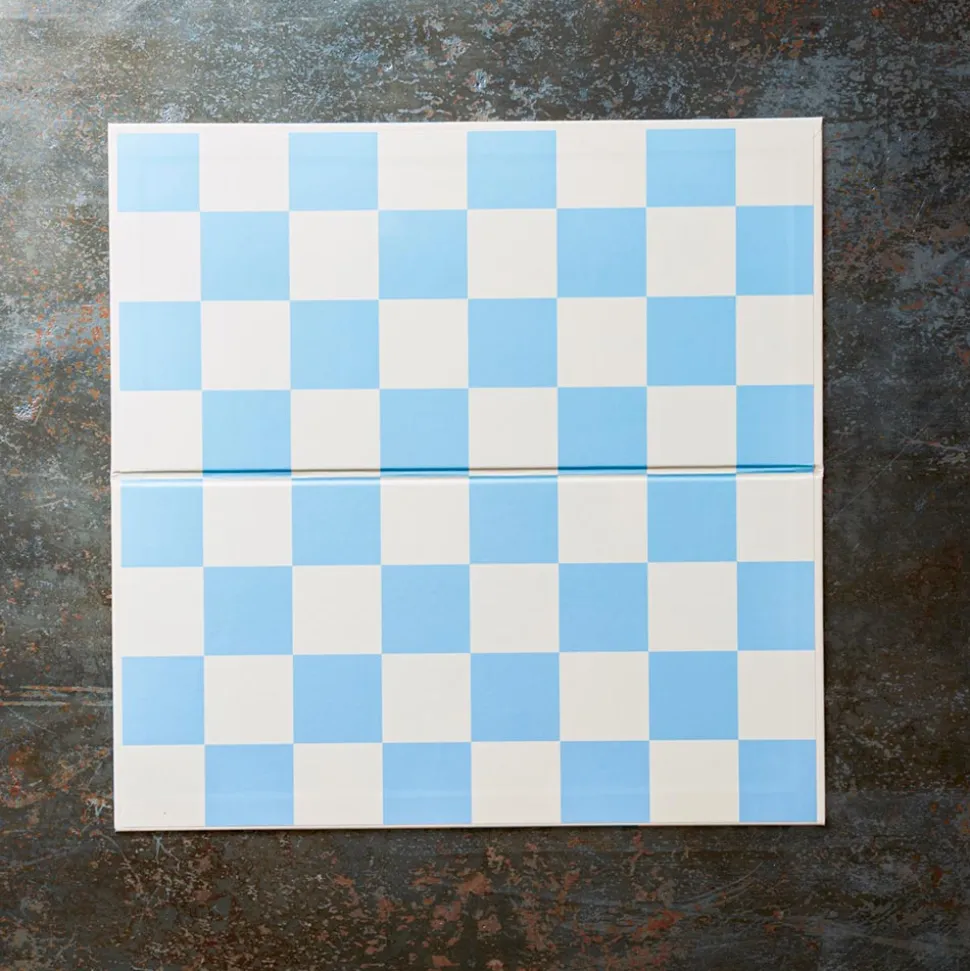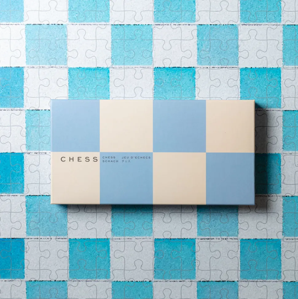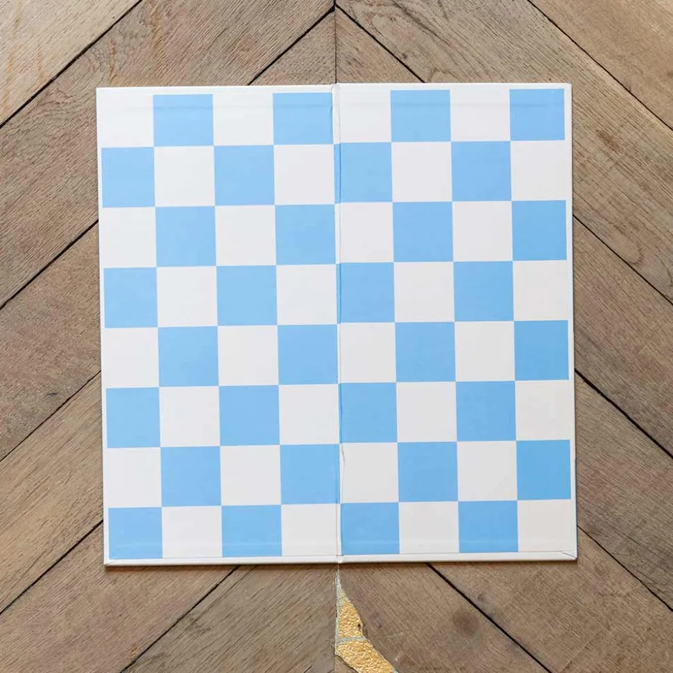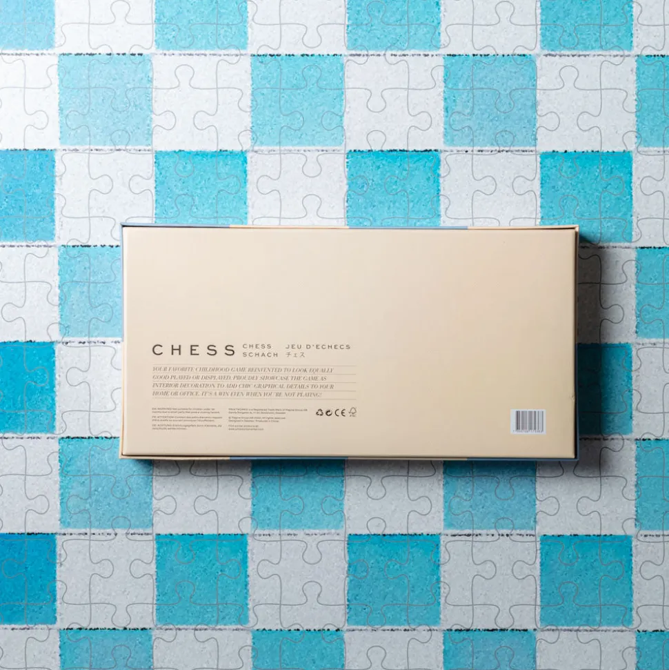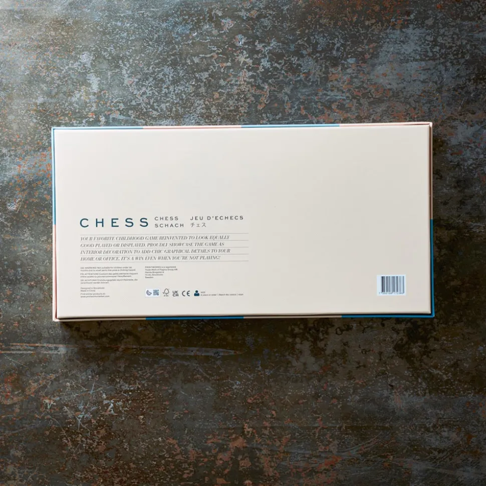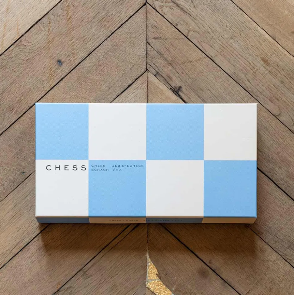 Jeu d’échecs bleu et blanc avec instructions faciles à lire en anglais, français et allemand