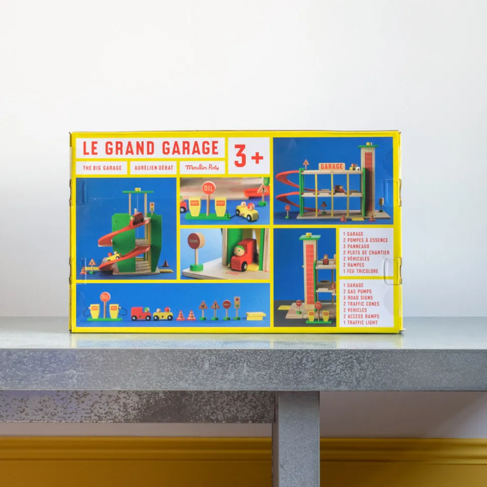 En collaboration avec Aurélien Débat, « Dans la ville » offre un garage et des véhicules en bois, différents jeux de construction et de manipulation, aux lignes design et épurées, aux couleurs franches et primaires
