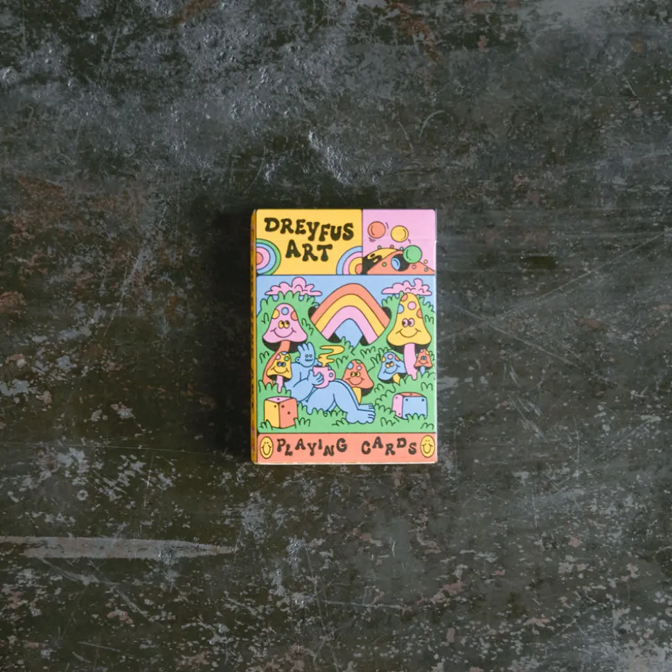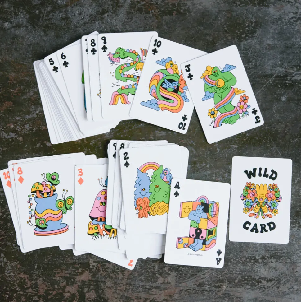 Réalisé en collaboration avec l’illustratrice Ashley Dreyfus, ce jeu de cartes entièrement personnalisé met en scène des personnages hauts en couleur, dessinés dans un style fantaisiste et psychédélique.
