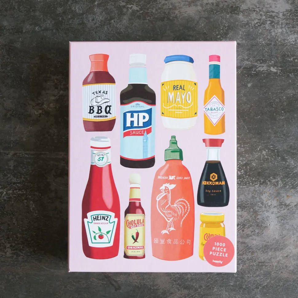 Puzzle Saucy de 1 000 pièces présentant des illustrations de condiments très appréciés, réalisées par la célèbre illustratrice Georgia Bacon