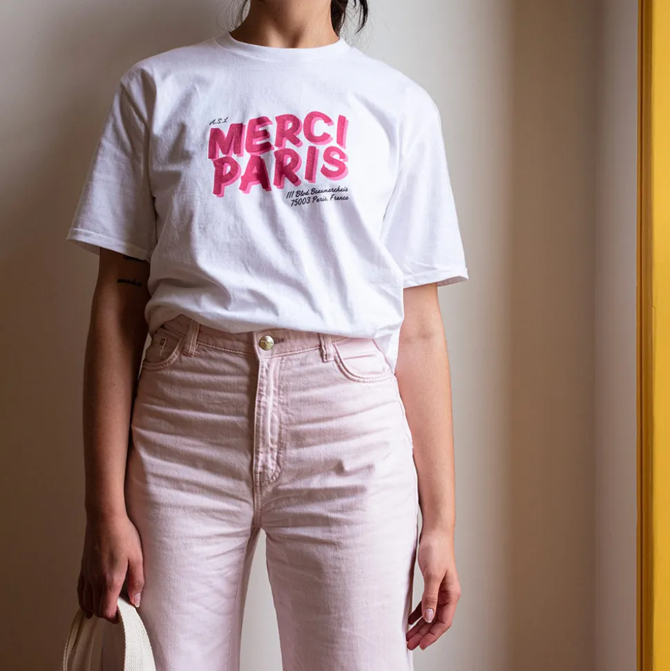 Logo Merci Merci imprimé sur le devant avec l’adresse de la boutique. Effet retro assuré