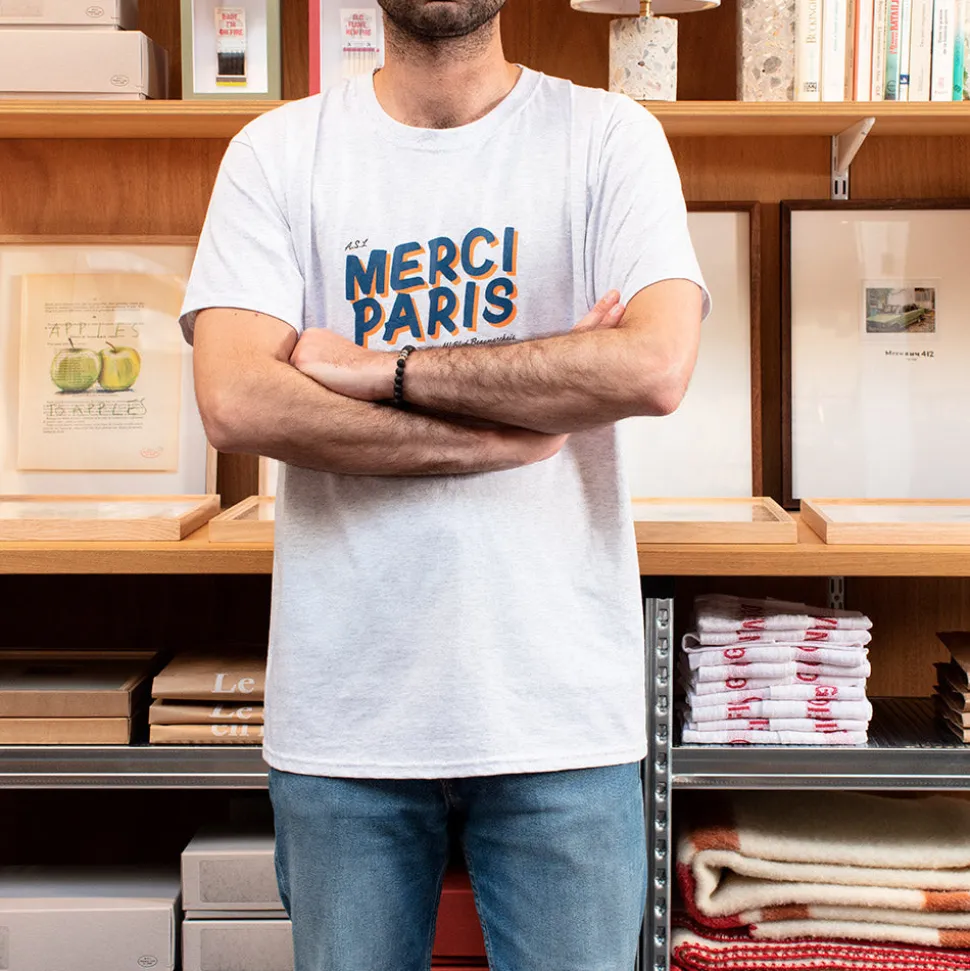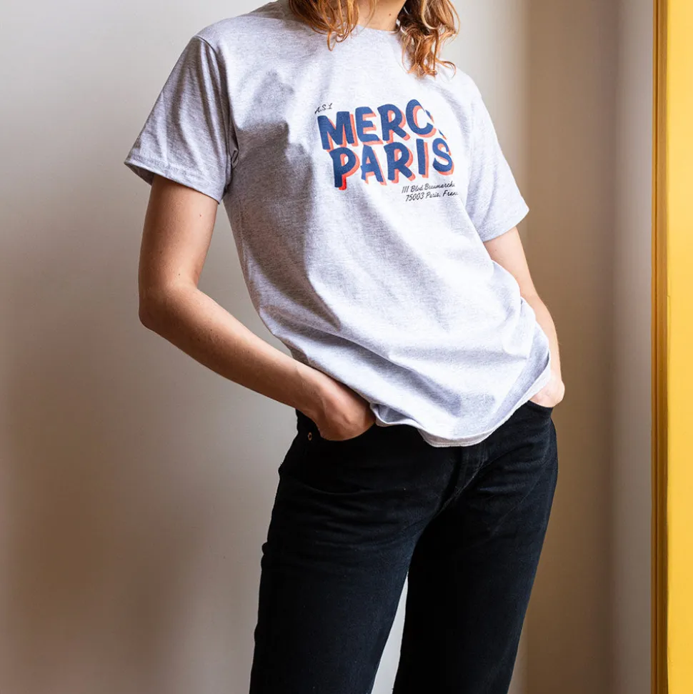 Logo Merci Merci imprimé sur le devant avec l’adresse de la boutique. Effet retro assuré