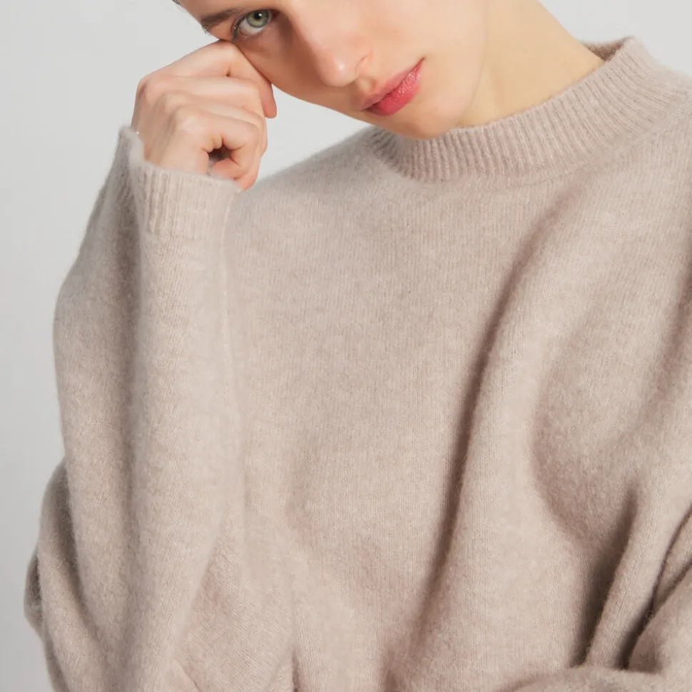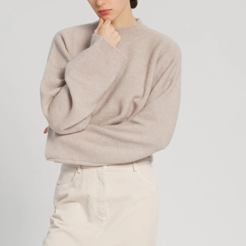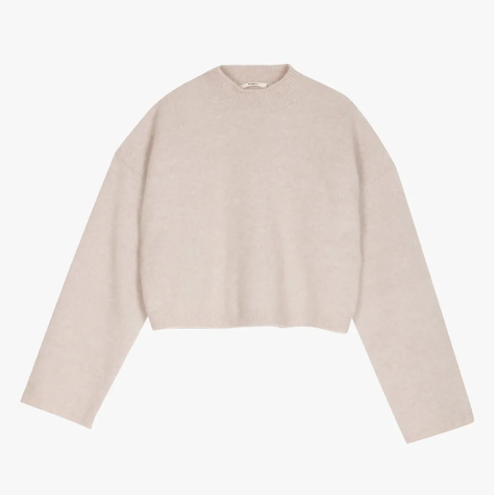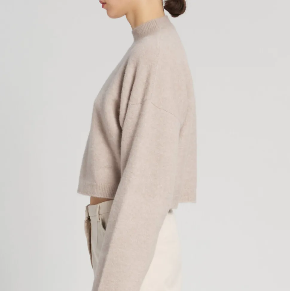 Pull court à col entonnoir et manches longues et larges. Épaules tombantes.