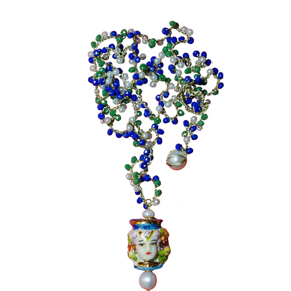 Zircon coloré et perles. « Testa di Moro » en céramique sicilienne de Caltagirone et perle naturelle.