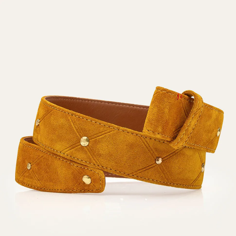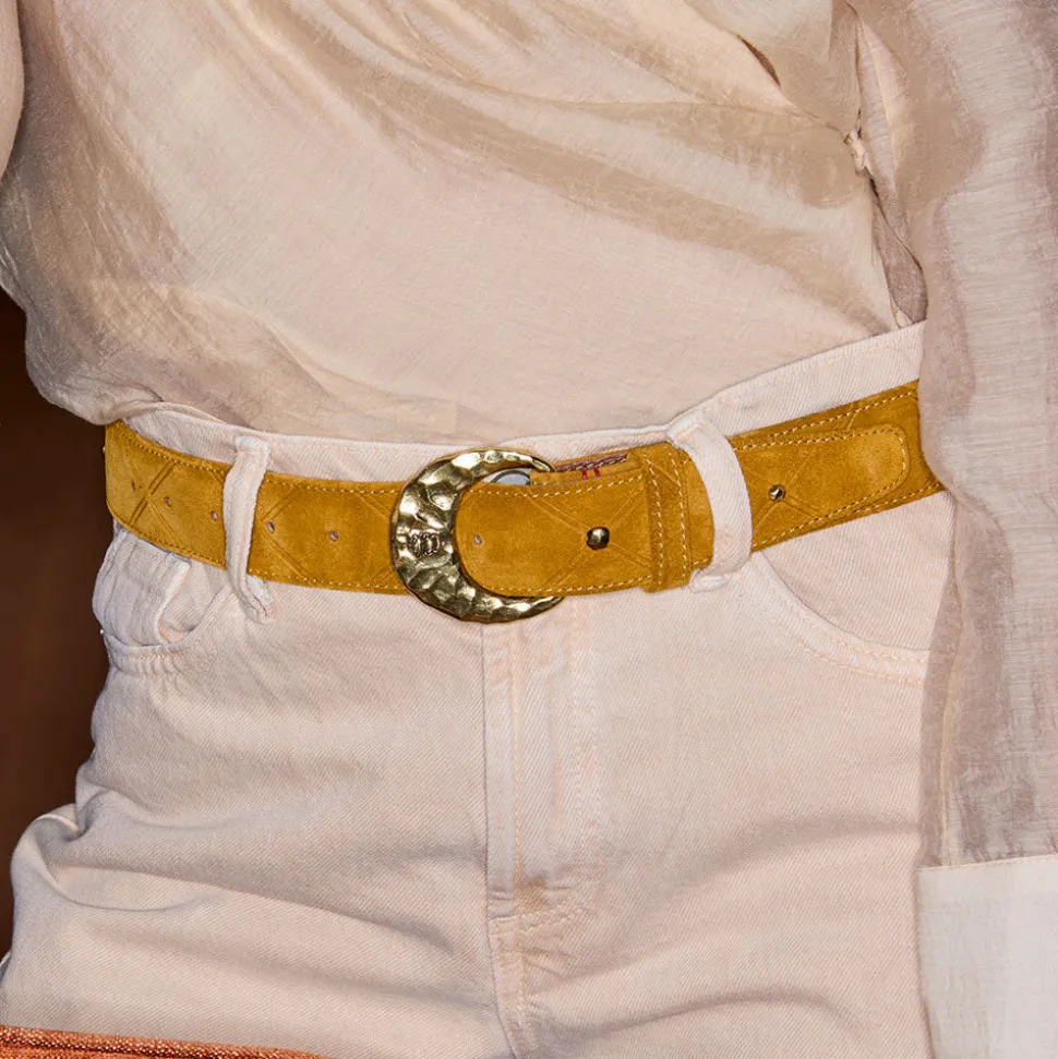 Ce ceinturon, doublé de cuir, est orné d’une magnifique boucle en laiton en forme de demi-lune.