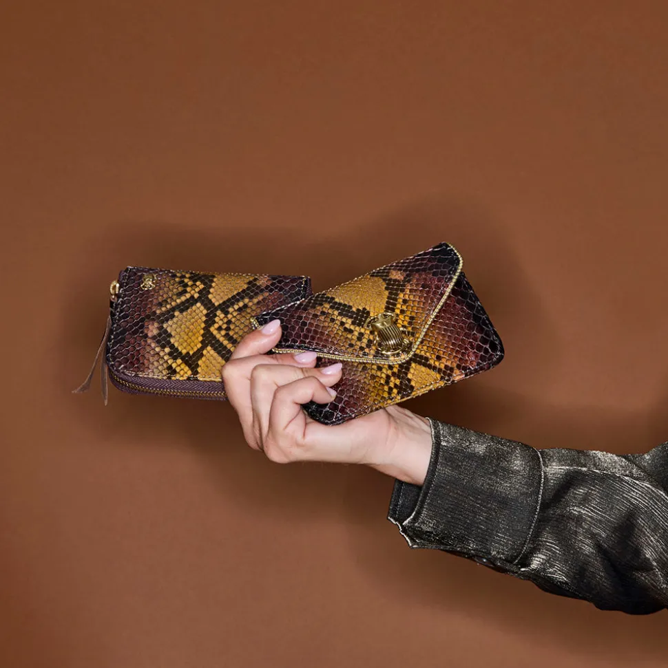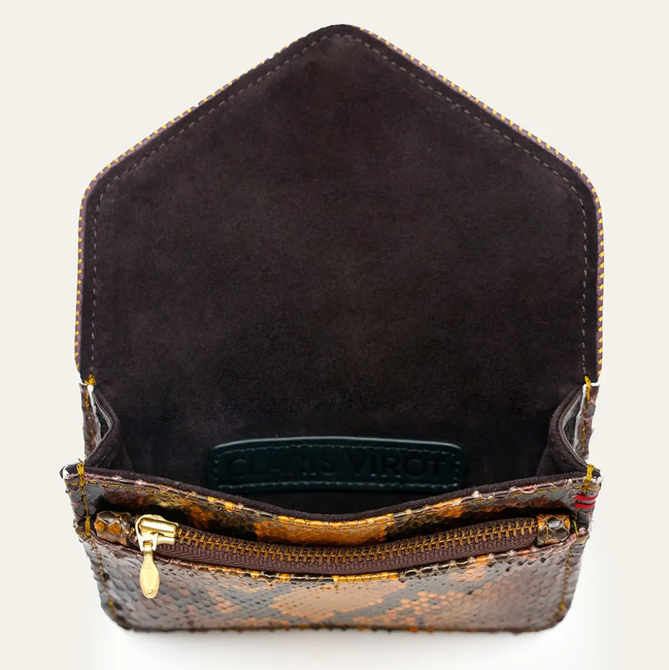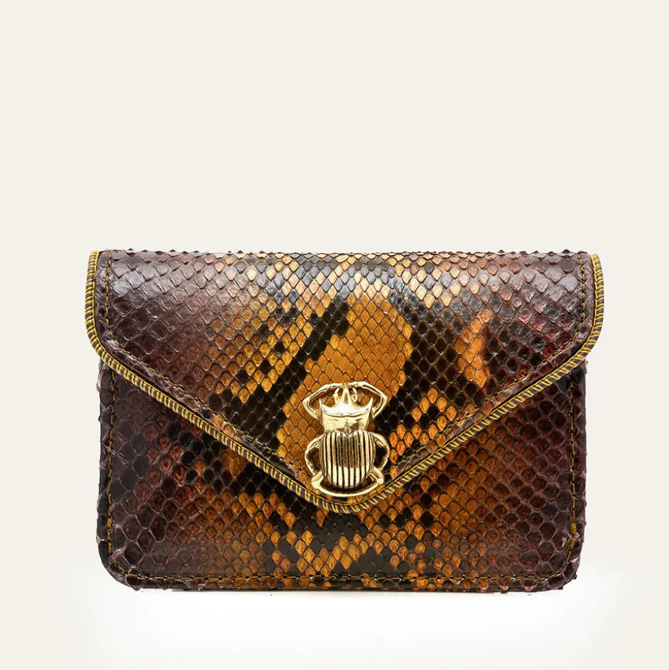 Cette petite pochette en python qui prend la forme d’une enveloppe est ornée d’un fermoir en forme de scarabée en laiton.