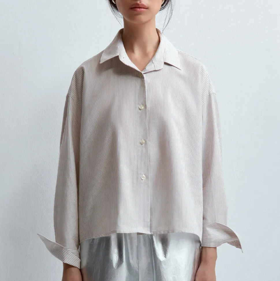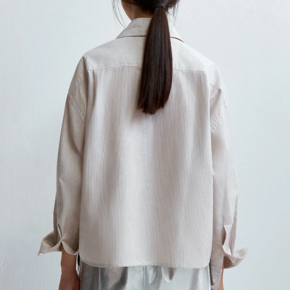 Les détails incluent l’imprimé sripe beige super fin, la coupe croisée surdimensionnée, les manches longues, les fermetures à boutons, le col pointu et la fermeture à un bouton sur les poignets.