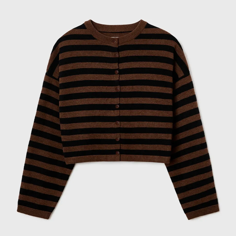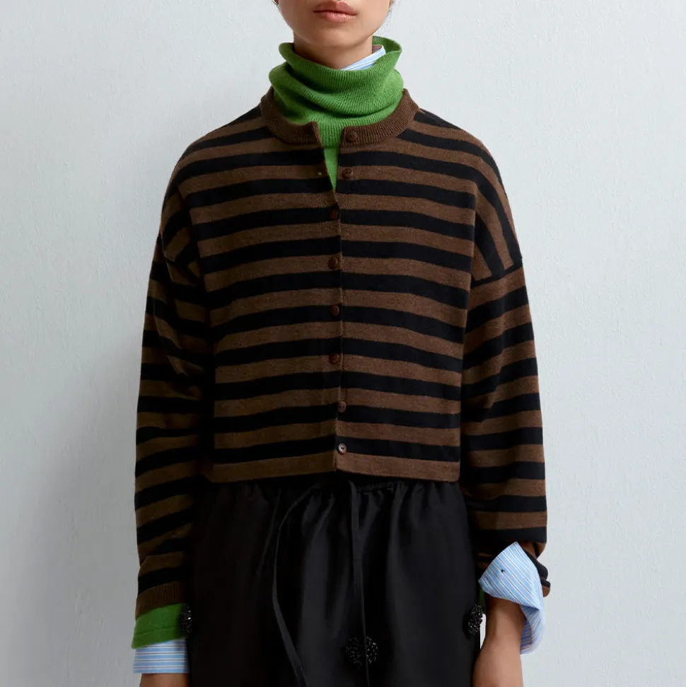 Ce cardigan cropped tricoté en laine mérinos extrafine est doté de petits boutons sur le devant, de manches longues et d’un col rond.