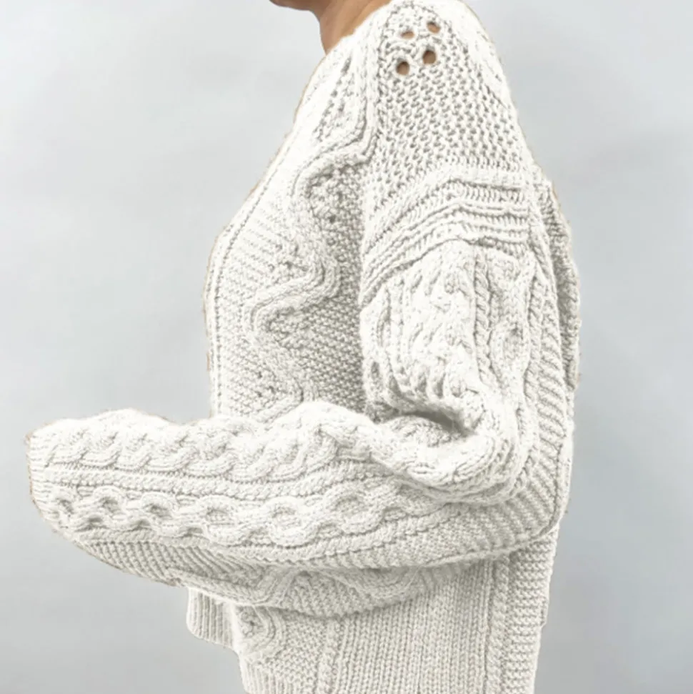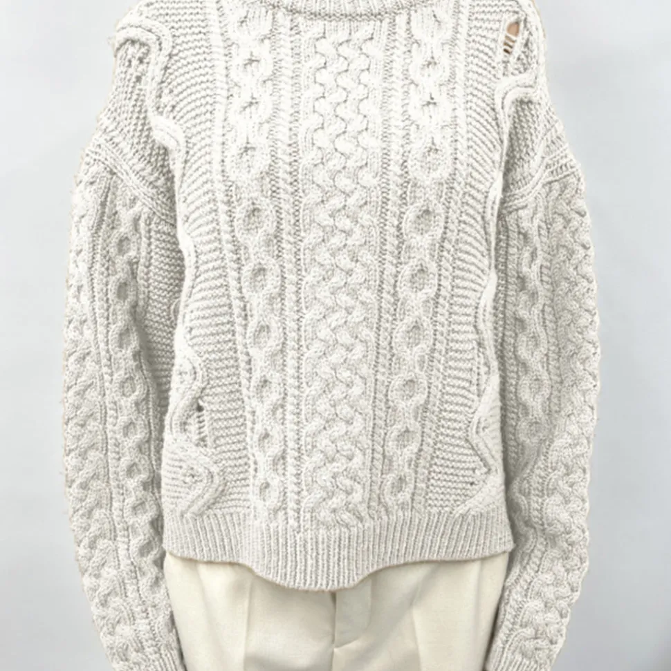 Matière lavable à la main en 100% laine, chaude et douce au toucher. Le motif câblé est tricoté de manière effilochée par endroits, ce qui lui confère un aspect vintage.