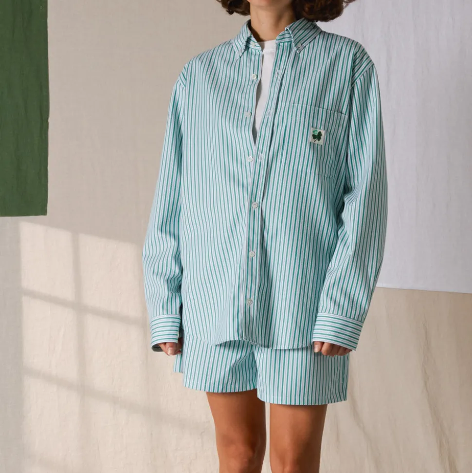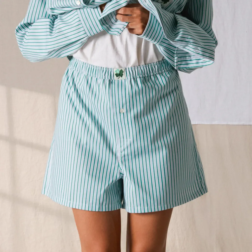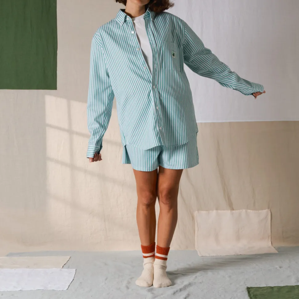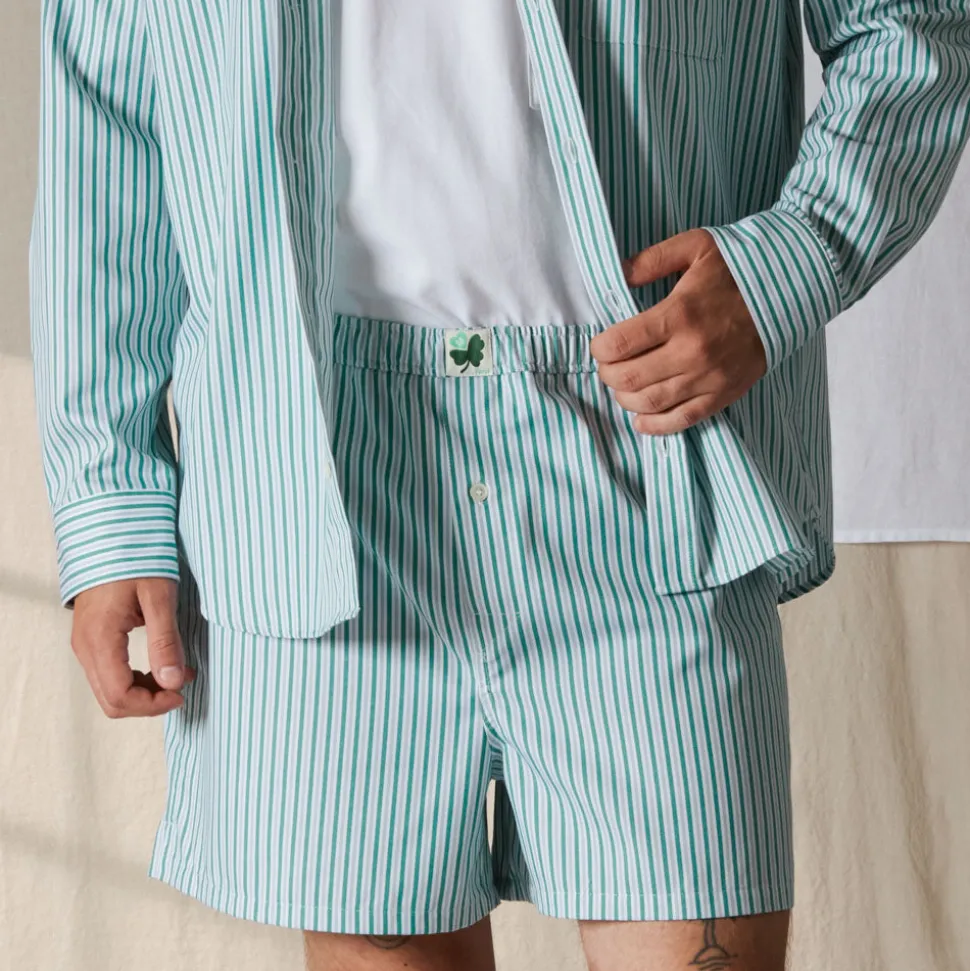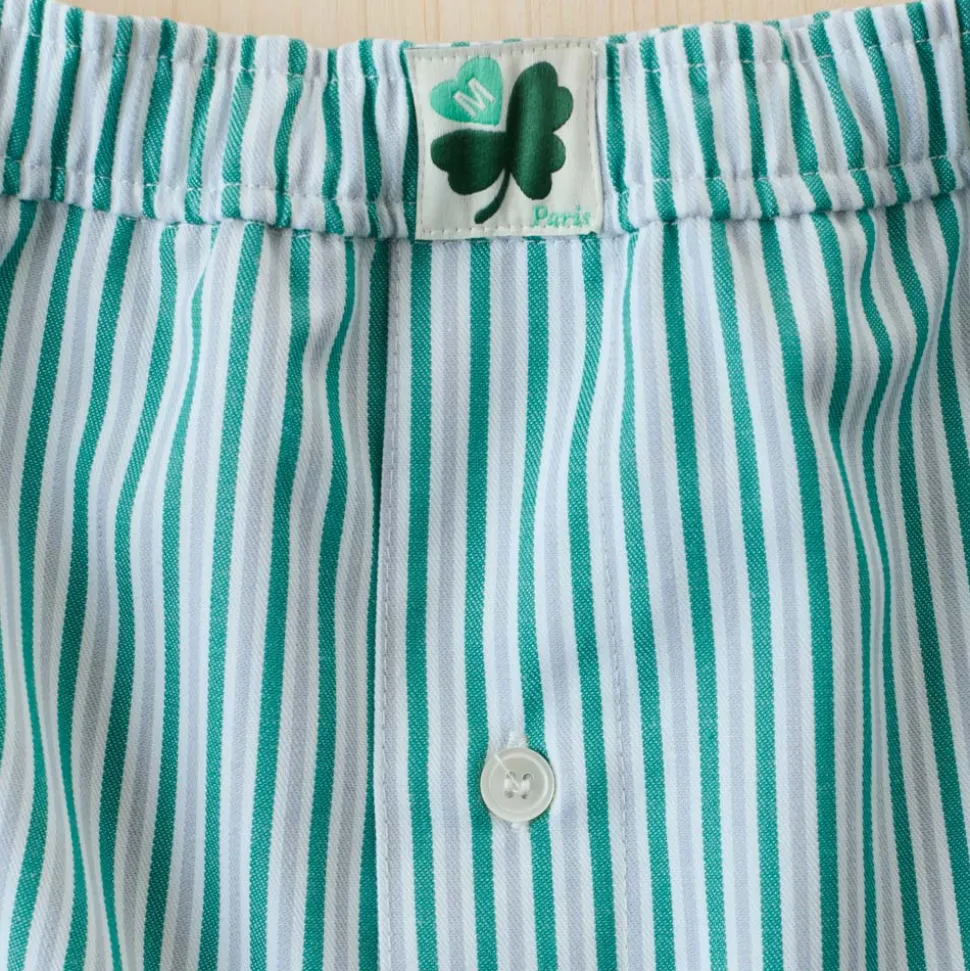 Merci dévoile son nouvel ensemble. Toujours accompagné de son étiquette Trèfle-Coeur, il offre un look décontracté alliant simplicité et confort. Composé d’une chemise à manche longue et d’un short boxer ample, cet ensemble en coton est décliné en six coloris à motif uni, rayures, ou carreaux.